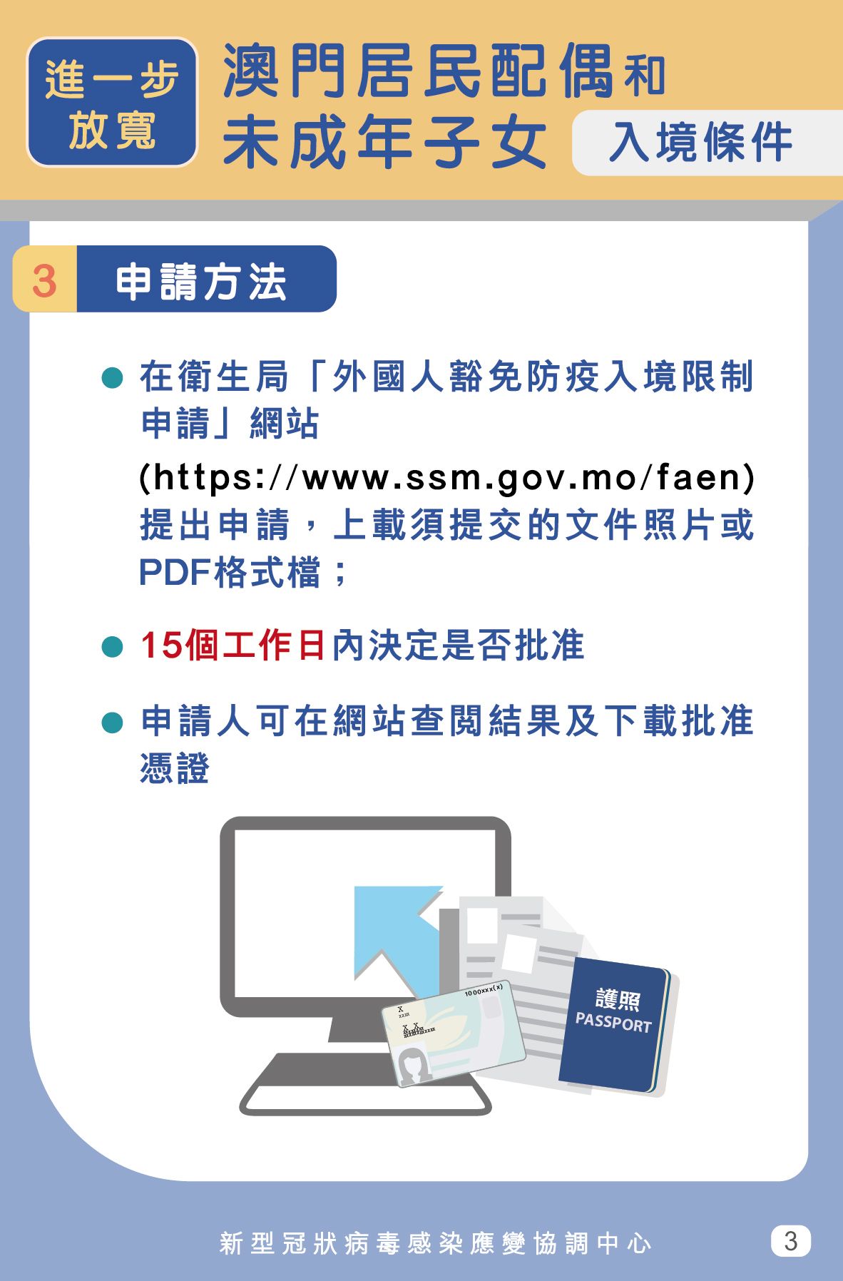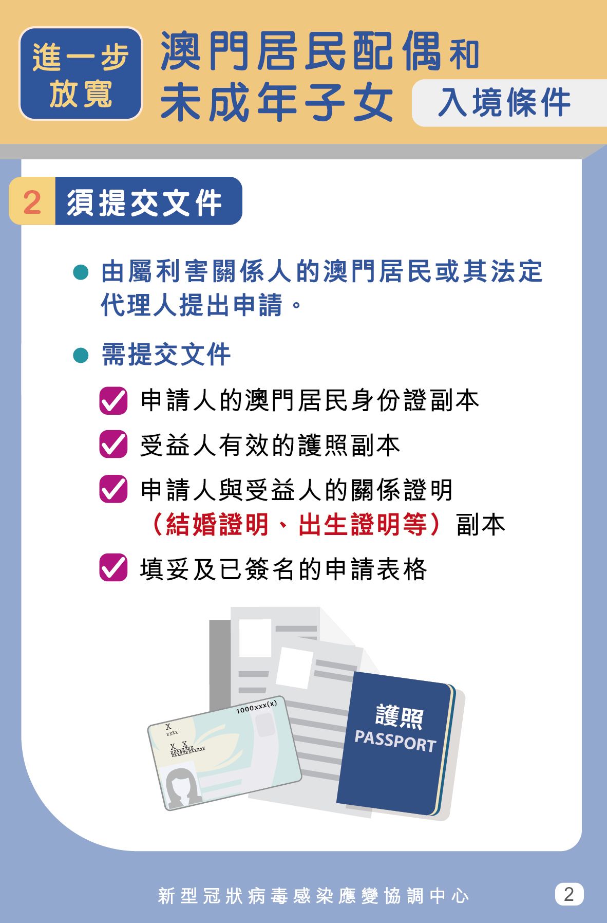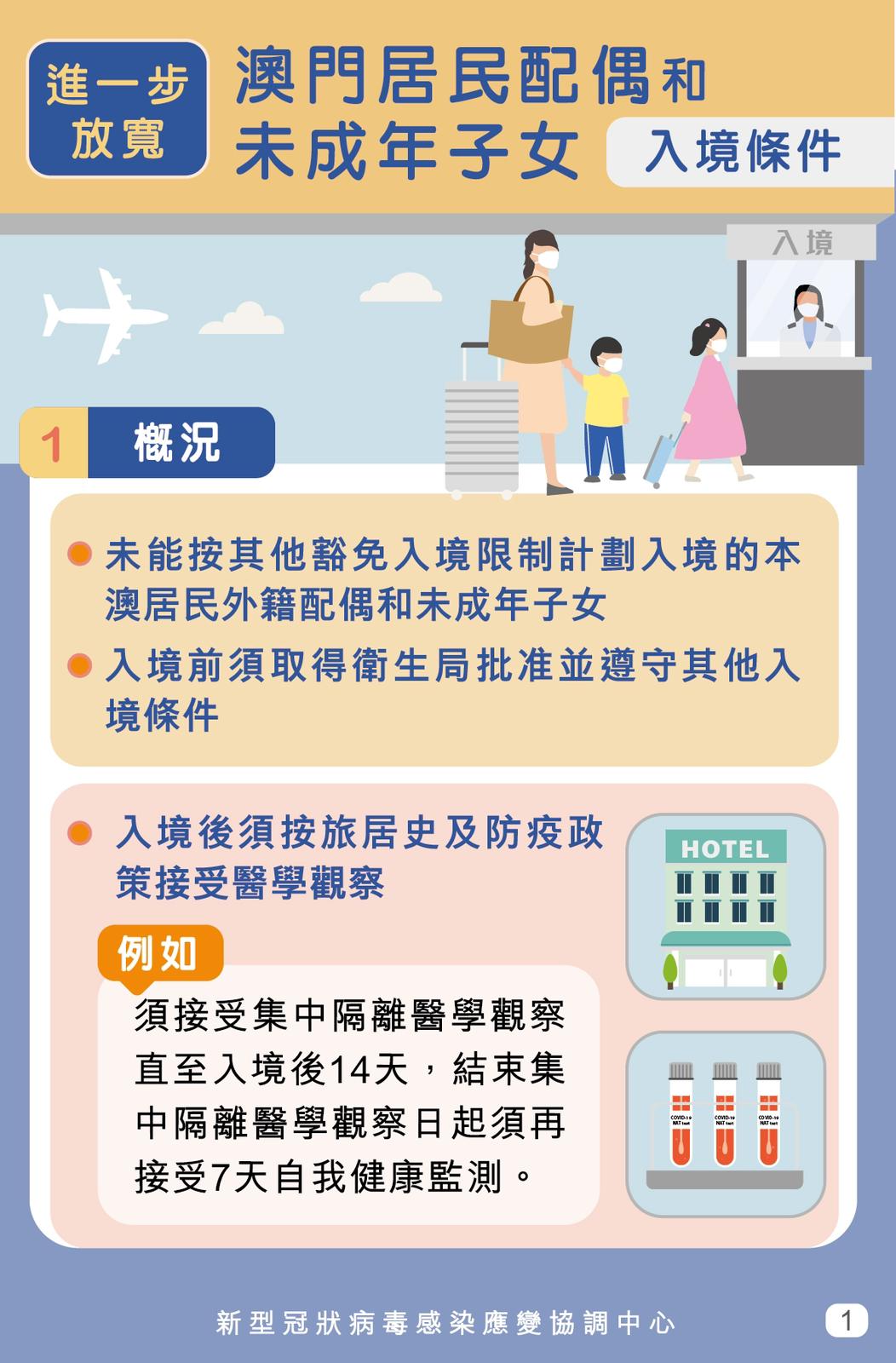 新型冠狀病毒感染應變協調中心(下稱應變協調中心)宣佈,經考慮澳門居民的實際需要及評估全球疫情風險和變化後,根據第64/2022號行政長官批示第三款的規定,自2022年5月30日起,未能按其他豁免入境限制計劃入境的澳門居民的外國籍配偶和未成年子女,可在取得衛生局事先批准並遵守其他入境條件的前提下入境澳門特別行政區。
