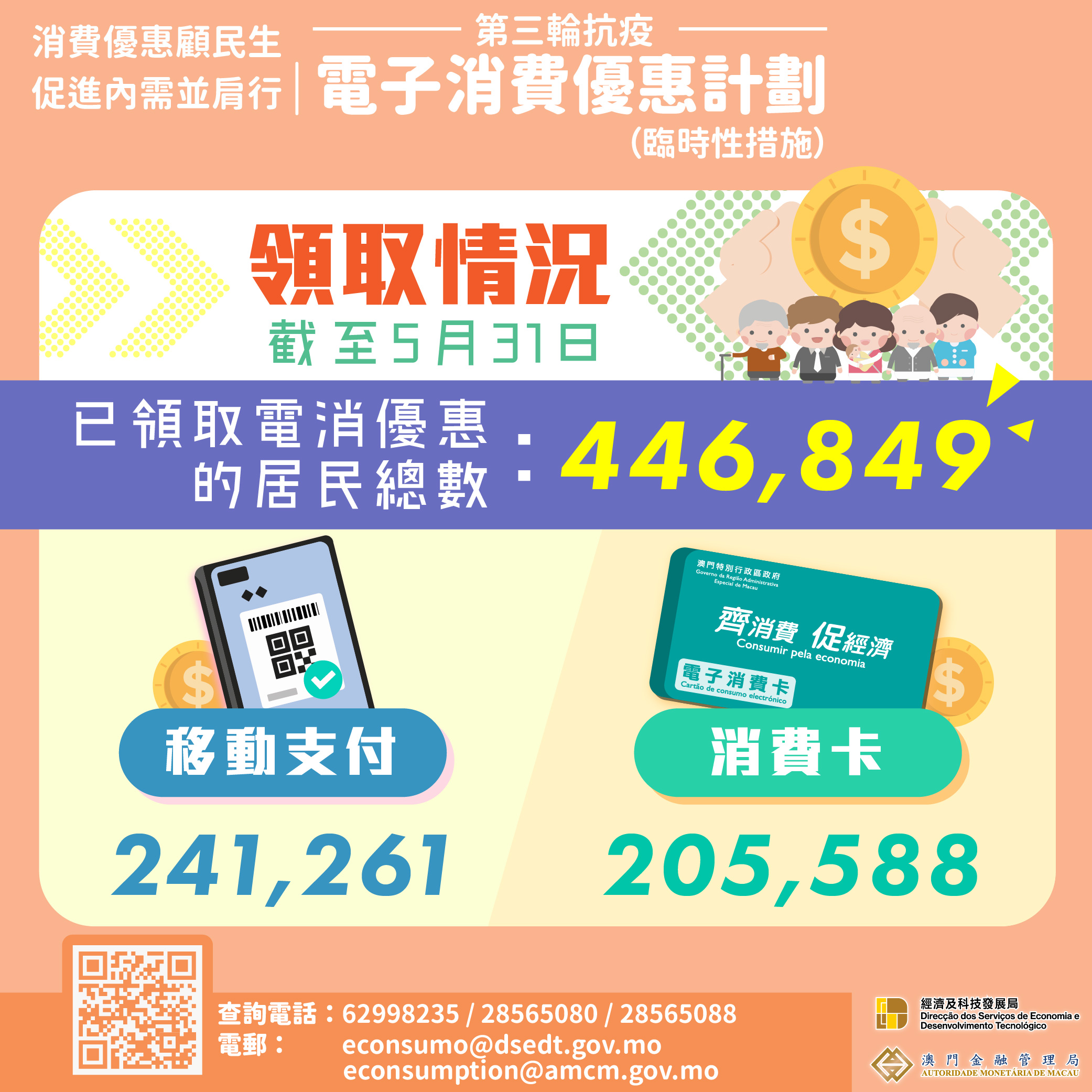 “電消優惠"自5月10日起接受網上登記,截至5月31日,已有56.2萬名居民完成登記,當中26.6萬人登記移動支付,29.6萬人登記消費卡。