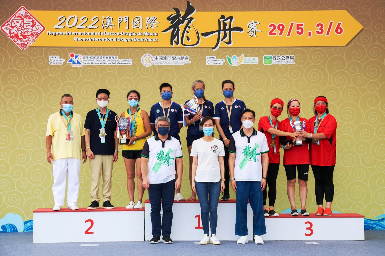 由體育局及中國澳門龍舟總會主辦,市政署及行政公職局協辦的“2022澳門國際龍舟賽”,今日(3日)端午節正日在南灣湖水上活動中心上演標準龍(500米)公開組及女子組賽事。經過連場競逐後,澳娛綜合-金禧與澳門青少年發展協會分別勇奪公開組及女子組冠軍。行政長官賀一誠出席活動觀賞龍舟賽事,並主持點睛儀式及頒獎,與市民歡度端午佳節。