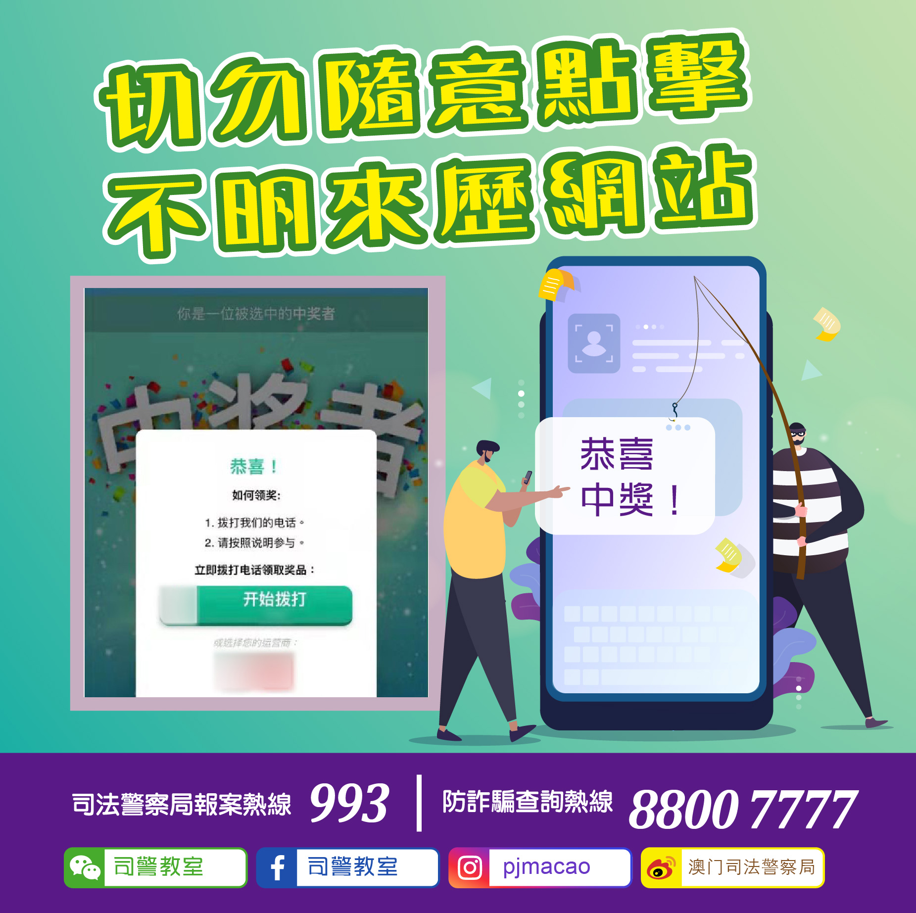 5. 懷疑遇到詐騙或其他犯罪時,應立即致電司警局防詐騙查詢熱線8800 7777或報案熱線993求助。