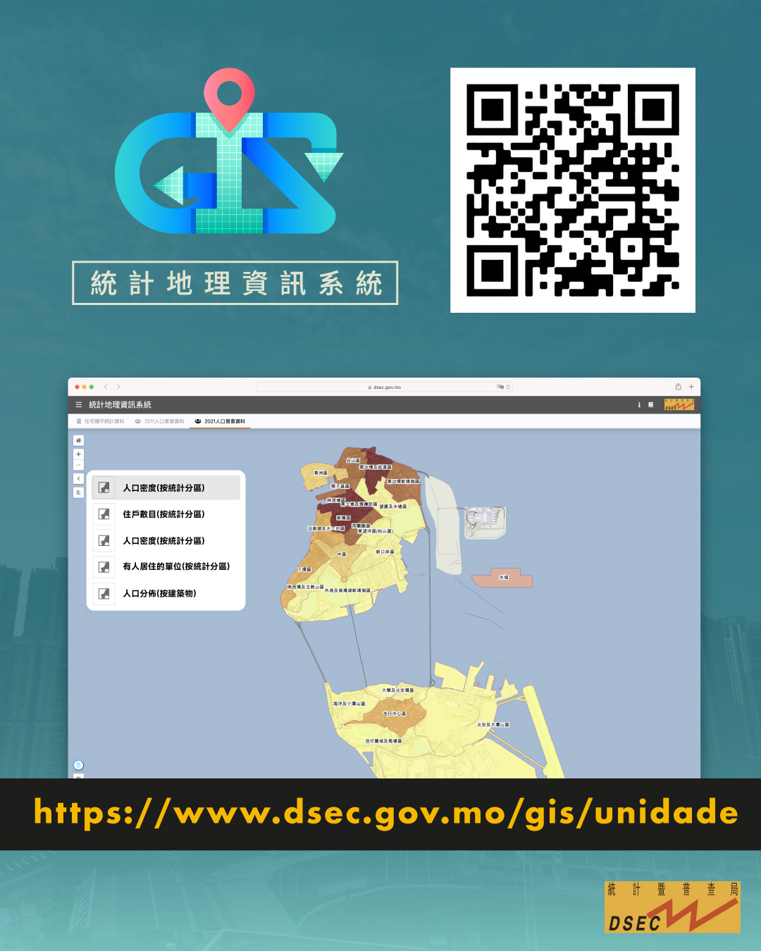 為收集詳細的人口數據,統計暨普查局於2021年8月進行了第16次人口普查及第6次住屋普查;繼去年底公佈了2021人口普查初步結果後,現公佈《2021人口普查詳細結果》報告,並同時在網頁推出「統計地理資訊系統(GIS)」及「人口數據資料庫」兩個查詢工具,方便市民迅速查找人口資料。