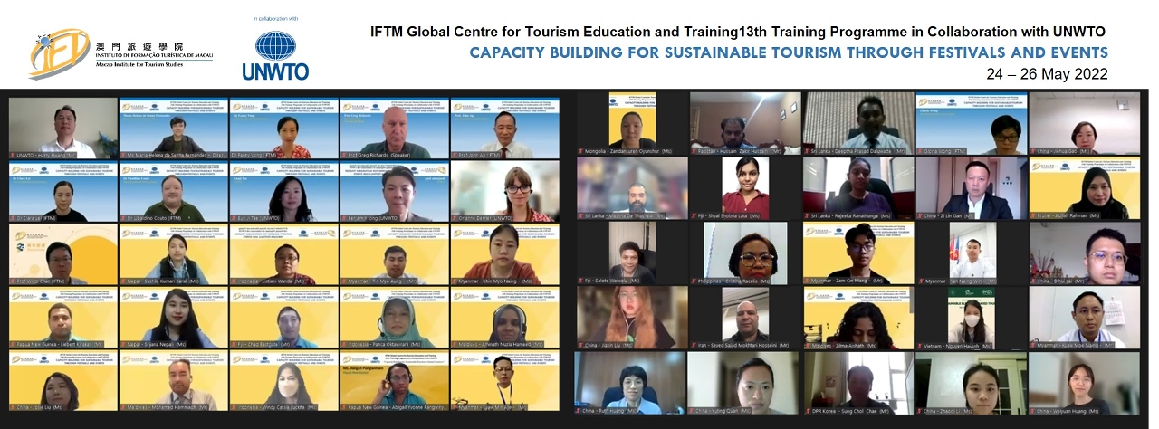 澳門旅遊學院世界旅遊教育及培訓中心與聯合國世界旅遊組織於2022年5月24 日至26日合作舉辦了第十三次培訓課程,課程以“以節日盛事促進可持續旅遊發展的能力建設”為主題,以線上形式進行。