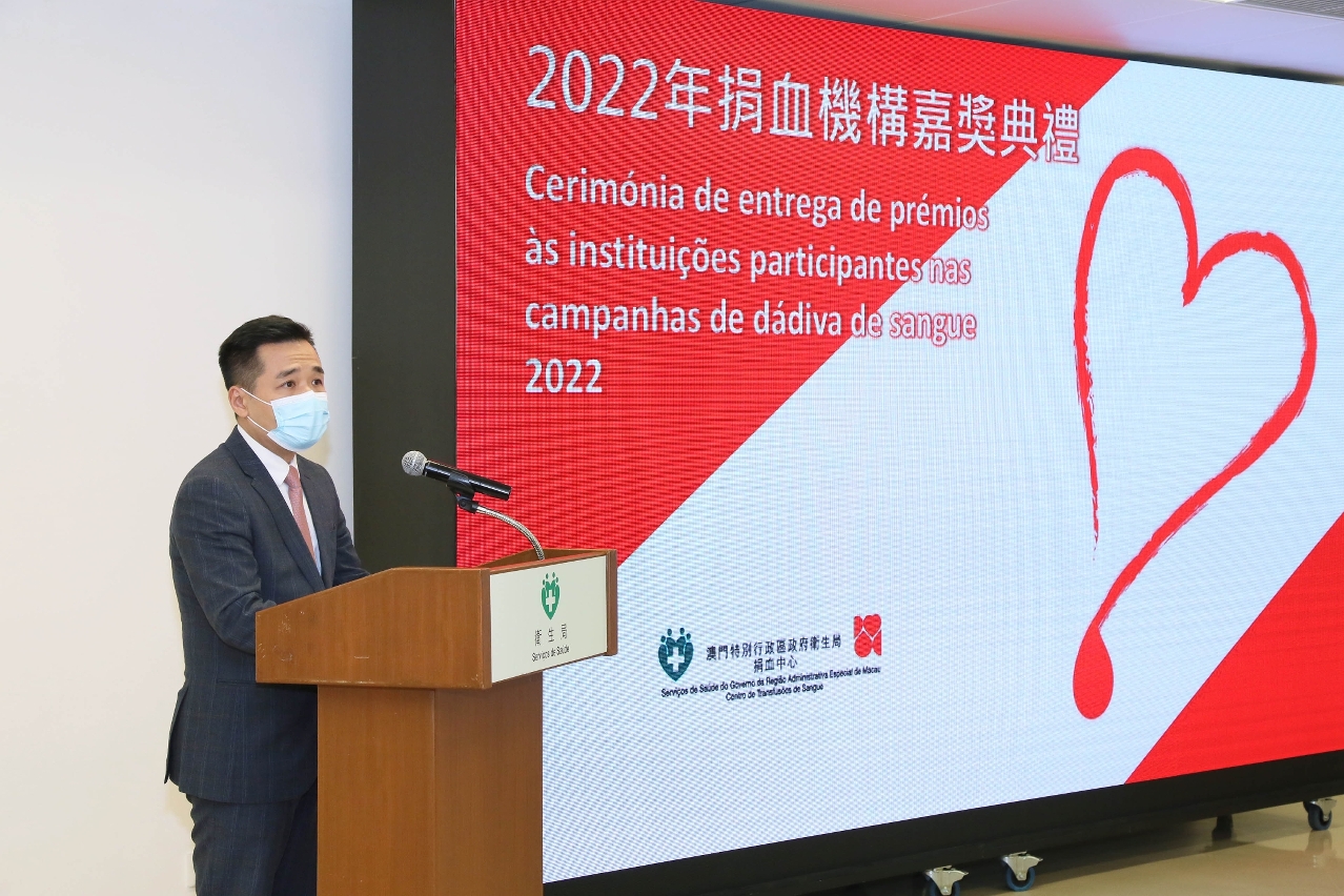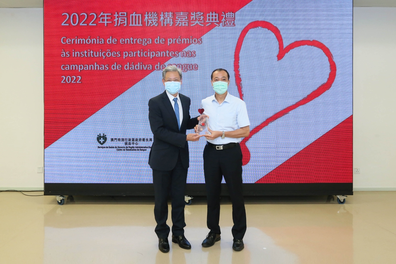 衛生局今(15)日舉行了2022年“世界捐血者日”系列活動之“捐血機構嘉獎典禮”,衛生局羅奕龍局長、郭昌宇副局長、鄭成業副局長、陳永華副局長、教育及青年發展局林文達廳長及捐血中心許萍主任出席了典禮,並向各獲奬機構代表頒發相關奬座,以感謝他們對維持本澳充足血液供應所作出的貢獻。