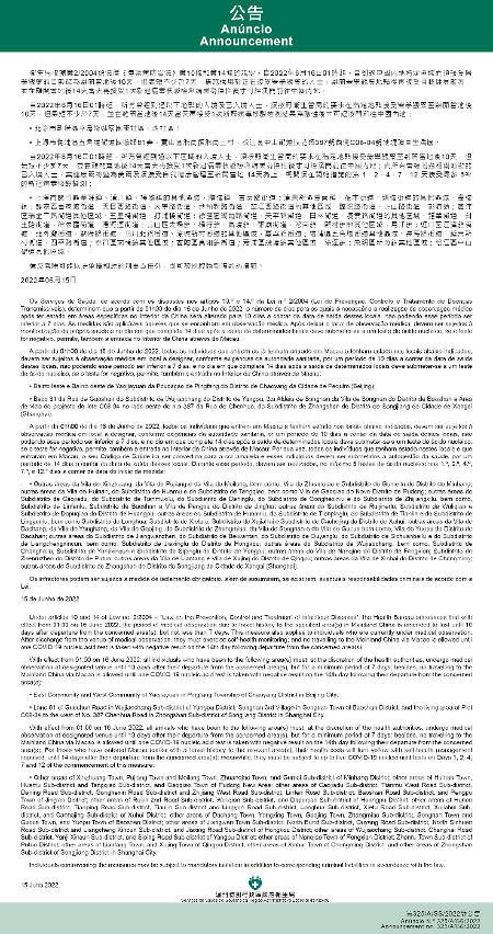 自2022年6月16日凌晨1時起,所有曾經到過以下區域的入境人士,須按照衛生當局的要求在指定地點接受醫學觀察至離開當地後10天,但最短不少於7天,並在離開當地後14天當天再接受1次新冠病毒核酸檢測結果為陰性後,才可經澳門前往中國內地;而所有曾經到過相關地點的已入境人士,其健康碼將變為黃碼及須接受自我健康管理至離開當地 14 天為止,期間須在開始措施的第 1、2、4、7、12天接受最多5次的新冠病毒核酸檢測:上海市閔行區莘莊鎮、浦江鎮、梅隴鎮的其他區域、顓橋鎮、古美路街道;浦東新區惠南鎮、花木街道、塘橋街道的其他區域、高橋鎮;靜安區曹家渡街道、天目西路街道、大寧路街道、共和新路街道、芷江西路街道的其他區域、臨汾路街道、寶山路街道、彭浦鎮;黃浦區瑞金二路街道其他區域、五里橋街道、打浦橋街道;徐匯區湖南路街道、天平路街道、田林街道、凌雲路街道的其他區域、龍華街道、斜土路街道、徐家匯街道、漕河涇街道;寶山區大場鎮、楊行鎮、高境鎮、張廟街道、淞南鎮、顧村鎮的其他區域,月浦鎮;虹口區江灣鎮街道、北外灘街道、歐陽路街道、四川北路街道、涼城新村街道的其他區域,嘉興路街道;楊浦區五角場街道其他區域、長海路街道、延吉新村街道、四平路街道;奉賢區南橋鎮其他區域;普陀區真如鎮街道;青浦區練塘鎮其他區域、徐涇鎮;崇明區新海鎮其他區域;松江區中山街道其他區域。