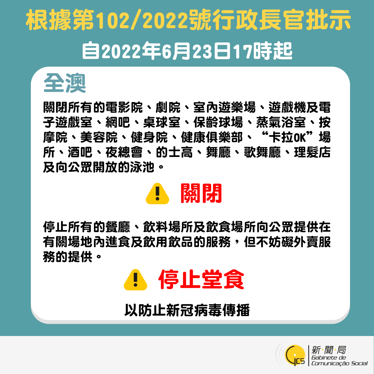 6月23日下午5時起關閉本澳特定場所設施 停止餐飲場所堂食