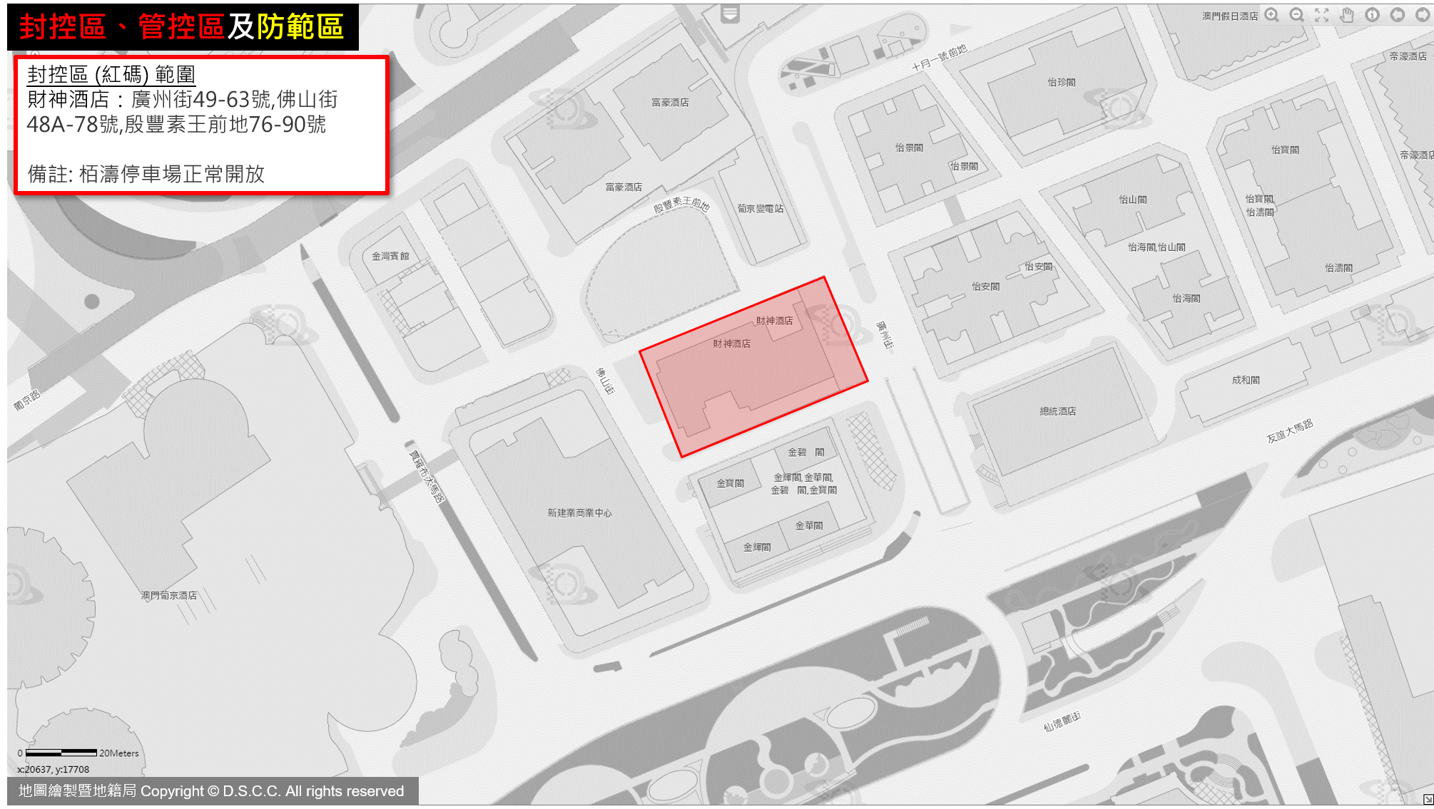 財神酒店﹕廣州街49-63號,佛山街48A-78號,殷豐素王前地76-90號(備註﹕栢濤停車場正常開放) |