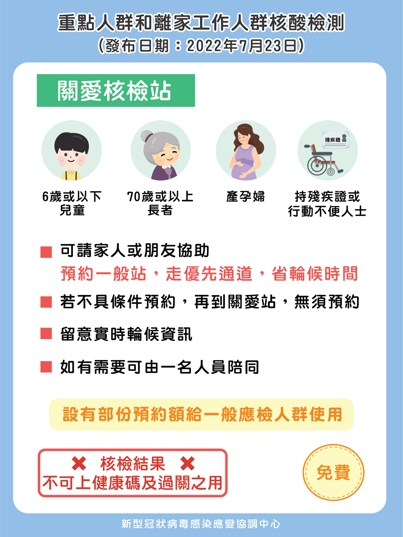 為節省輪候時間,建議關愛對象儘量請家人或朋友協助預約使用一般核檢站的優先通道進行採樣。一般核檢站必須預約,請準時到場輪候,逾時到達須重新預約。此外,亦無須過早提前到達,提前超過半小時會被勸回;檢測須帶備身份證明文件正本(核檢登記證件必須與健康碼申報證件一致,非澳門居民則須帶備旅遊證件)、預約碼和健康碼截圖。