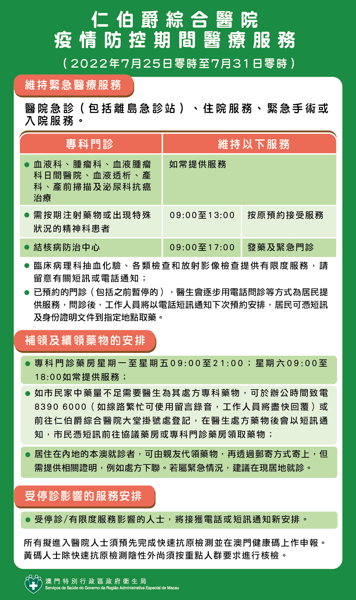 為配合特區政府對疫情防控「鞏固期」內的各項防疫措施,自2022年7月25日零時至7月31日零時仁伯爵綜合醫院、衛生中心/站的醫療服務、補領及續領藥物等相關安排如下: