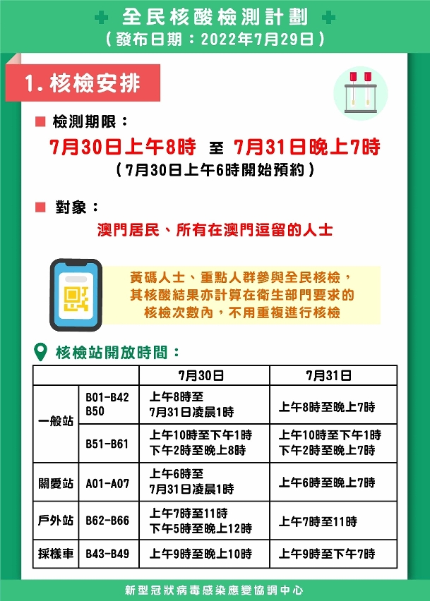 3. 5個戶外核檢站開放時間為7月30日早上7時至11時,下午5時至晚上12時,共兩個時段;7月31日早上7時至11時一個時段;當中祐漢街市公園核檢站設有紅碼專道,僅供因未按時參加重點區域或重點人群核檢,其澳門健康碼被轉為紅碼的人士使用;