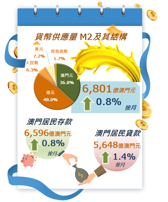 流通貨幣及活期存款分別增加1.1%及2.5%,M1因而較上月上升2.1%。與此同時,準貨幣負債增加0.7%,因此包括M1及準貨幣負債的廣義貨幣供應量M2遂按月上升0.8%,金額為6,801億澳門元。若與2021年同期比較,M1及M2分別下跌4.2%及2.2%。按幣種分析,澳門元、港元、人民幣及美元在M2的比重分別為36.8%、48.0%、6.3%及7.2%。