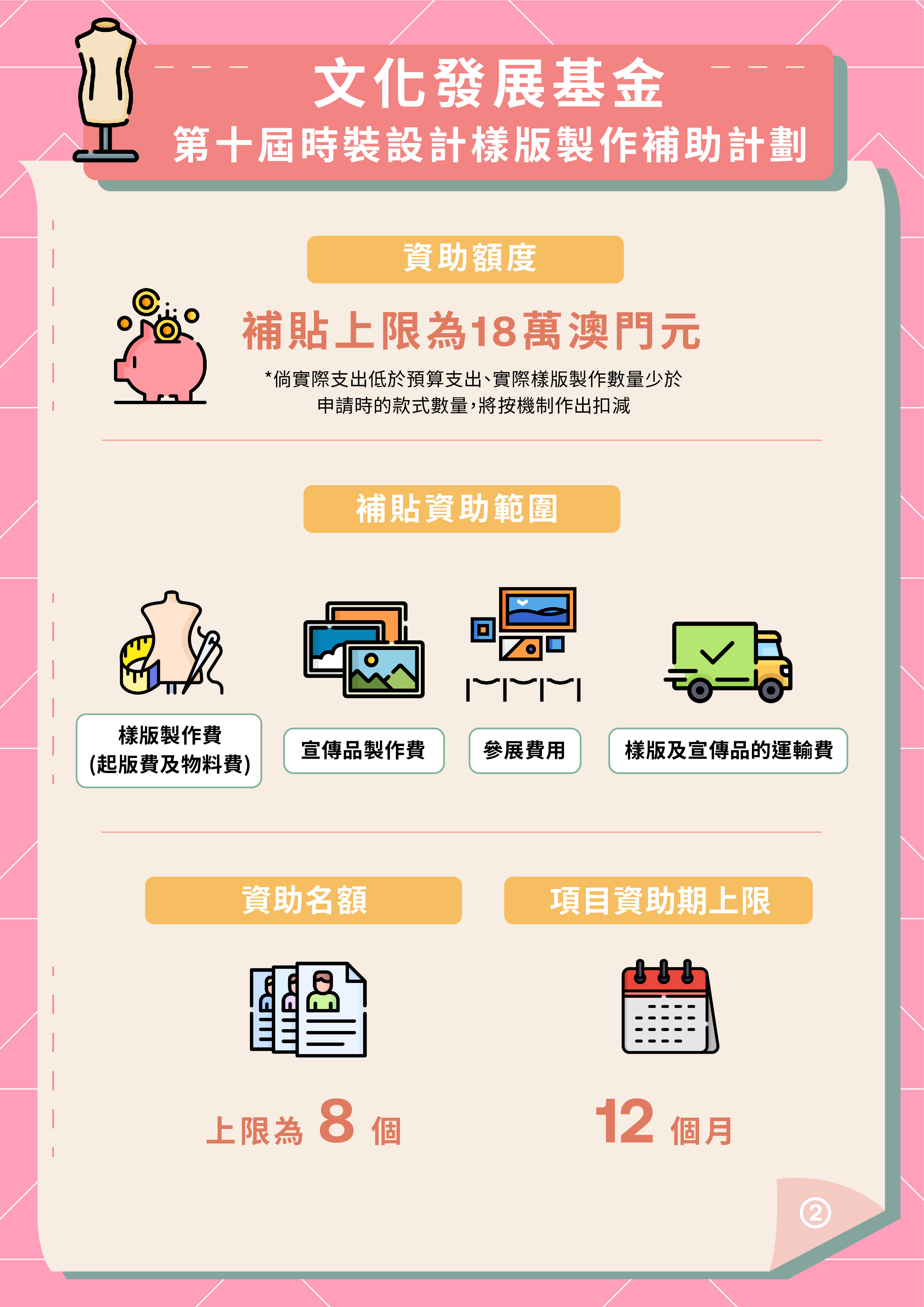 文化發展基金於8月9日至10月7日期間接受“第十屆時裝設計樣版製作補助計劃”申請,提供最多8個資助名額,支持業界開展時裝設計樣版及宣傳品製作。