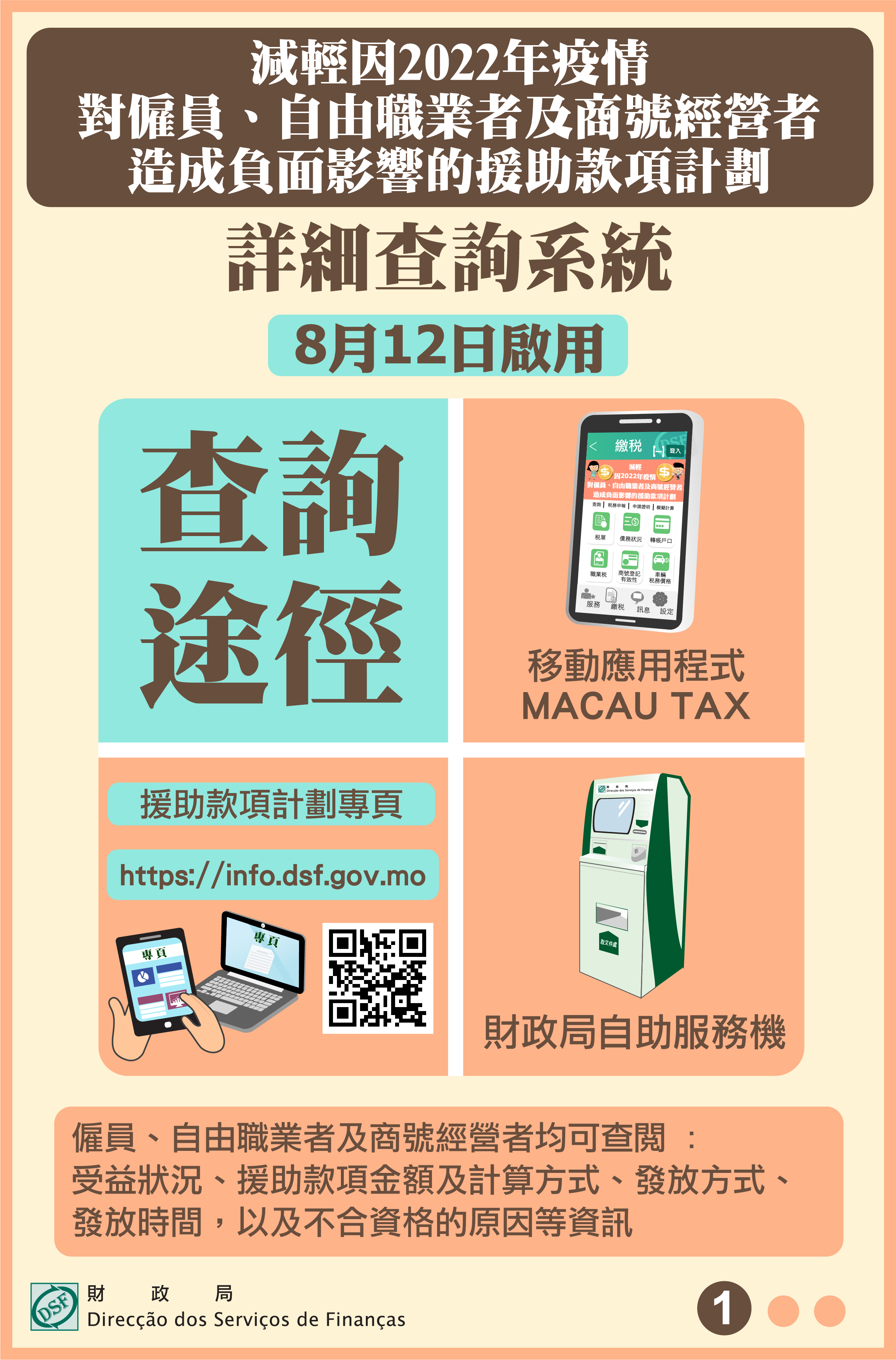 為方便居民查詢,財政局已於8月1日推出援助計劃專頁(https://info.dsf.gov.mo)及僱員簡易查詢系統,詳細查詢系統將於明(12)日上午9時啟用。