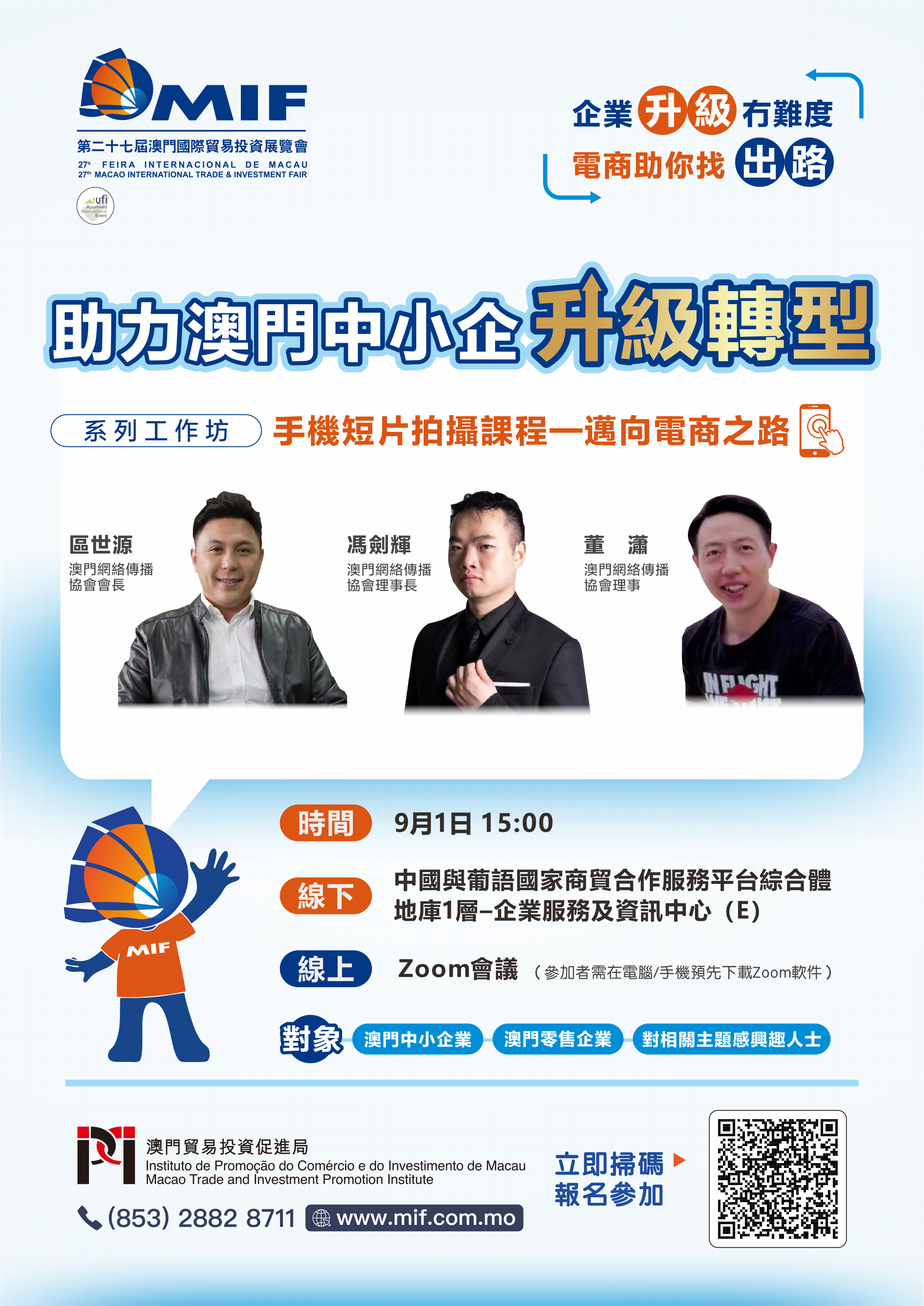 第27屆MIF於8月18日及9月1日,以線上線下融合形式舉辦兩場“助力澳門中小企升級轉型”系列工作坊,以“直播電商”為主題,邀請行業專家代表分享行業發展趨勢、基礎操作技巧等最新資訊,務求讓澳門中小企業在展前做好準備,更好利用展會的線上展廳、現場直播等安排,擴大產品推廣及銷售渠道,以及提升企業的技術含量。