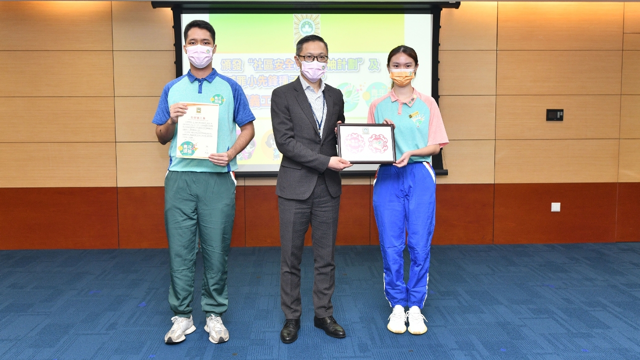 薛仲明局長致辭時表示,兩項青年計劃經受疫情順利完成,參與學員努力學習防罪滅罪知識,積極參與社區防罪宣傳,全力配合甚至參與抗疫工作,熱心關懷弱勢群體,展現了青少年堅強的意志、積極樂觀和無私奉獻的精神,向社會廣泛傳揚防罪守法訊息和正向能量,成為年輕人的表率和模範。他期望學員們繼續發揚社區安全青年領袖和滅罪小先鋒愛國愛澳、勇於承擔的精神,發揮正面影響力,帶動更多年輕人關心和服務社會,為祖國和澳門的建設發展貢獻力量。