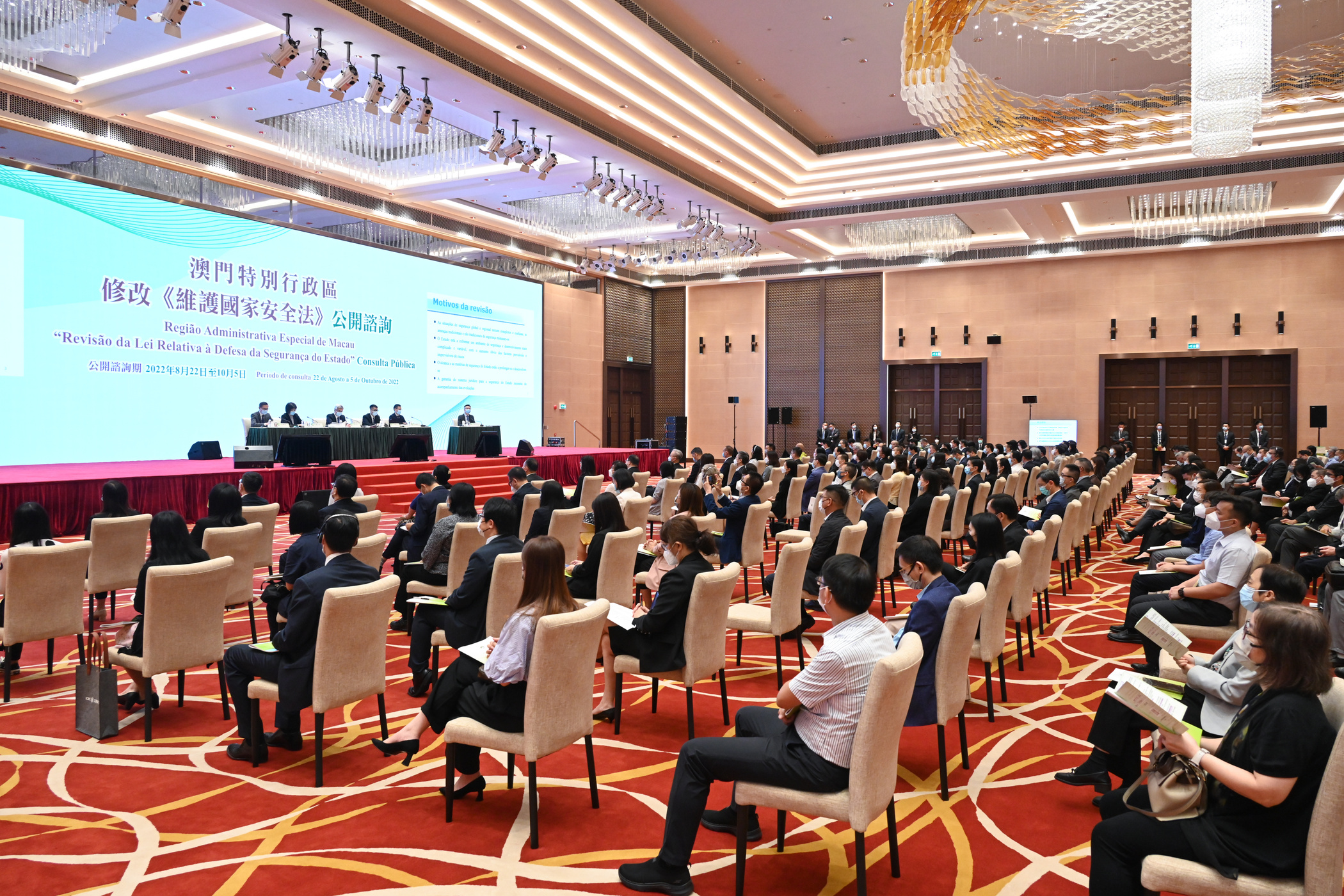 澳門特別行政區今(9)日就修改第2/2009號法律《維護國家安全法》舉行第六場公開諮詢會,聽取行政法務界別的意見和建議。諮詢會下午3時在中國與葡語國家商貿合作服務平台綜合體會議廳舉行,接近200人出席了諮詢會。