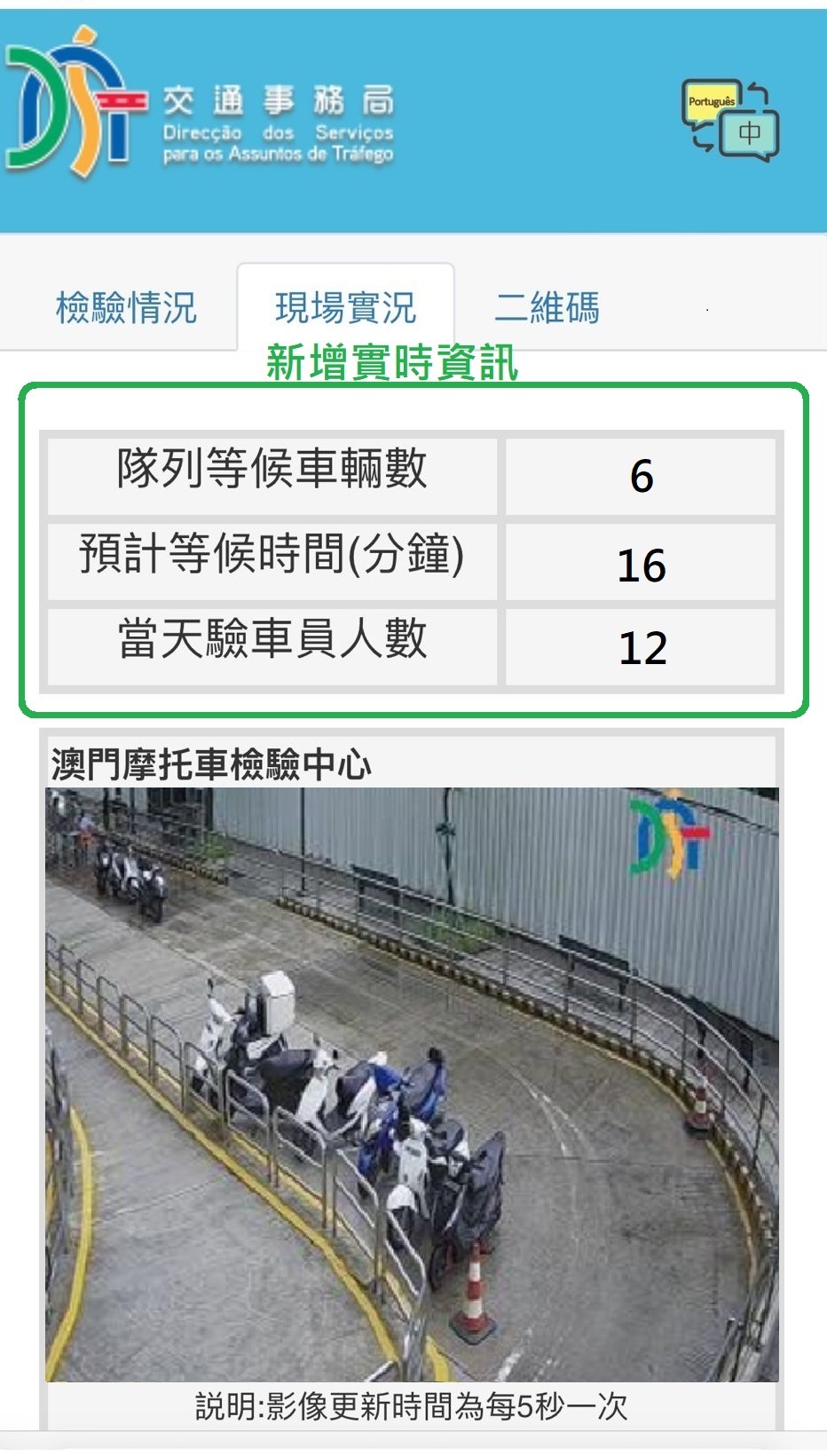 9月13日起,澳門摩托車檢驗中心將採用新驗車系統設備及優化流程,並會同步升級實時資訊發佈,包括增加“隊列等候車輛數”、“當天驗車員人數”及優化服務顯示屏界面佈局,以及增設手機短訊(SMS)提示,向已報到之送檢人提示輪候情況。送檢人士可透過場內顯示屏或掃瞄報到憑條上的二維碼瞭解相關實時資訊。此外,局方亦製作驗車流程影片(https://www.youtube.com/watch?v=Z2-Wpxmfhio ),方便市民瞭解臨時檢驗安排。