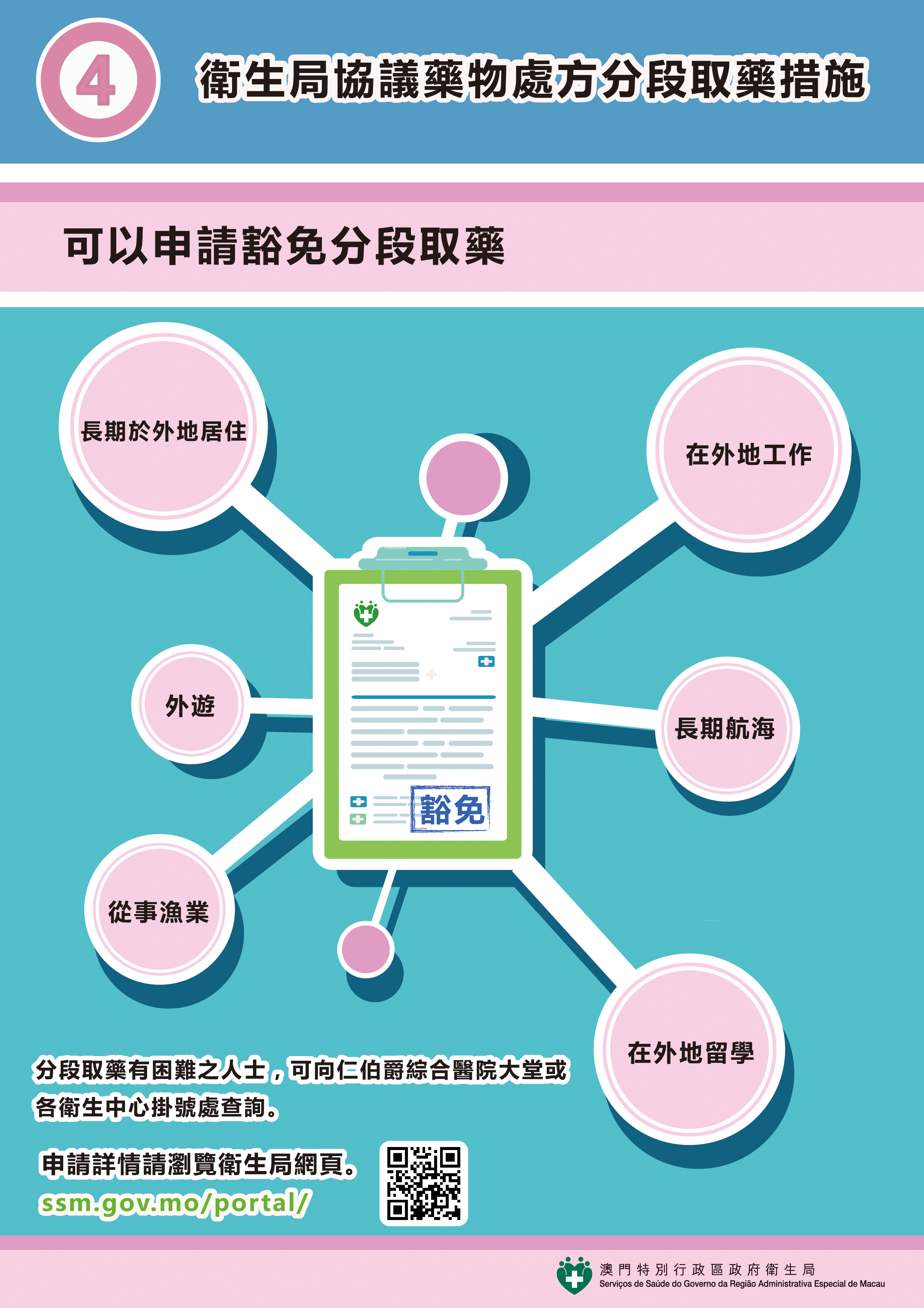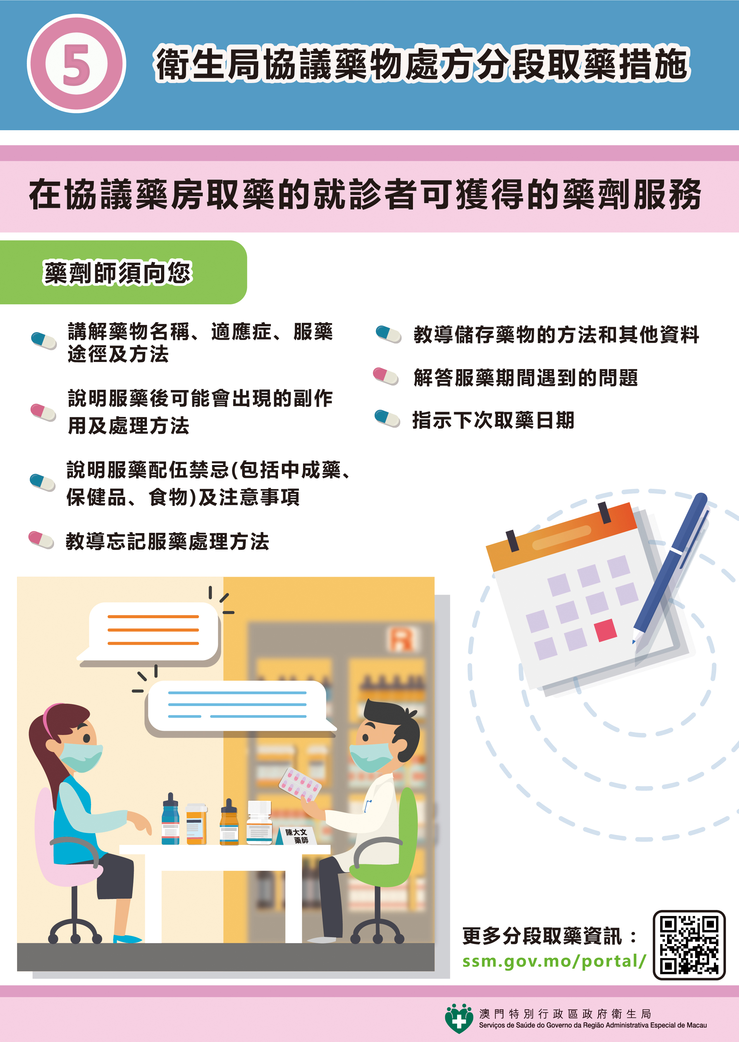 衛生局表示,居民亦可透過“協議藥物處方分段取藥措施"資訊專頁 (網址:https://www.ssm.gov.mo/apps1/StagedMedicineSupply/ch.aspx ) 查閱有關的圖文包及宣傳短片,了解更多關於分段取藥措施的詳情。