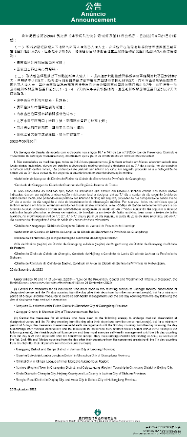 新型冠狀病毒感染應變協調中心(下稱應變協調中心)宣佈,因應內地的疫情變化,衛生局根據第2/2004號法律《傳染病防治法》第10條和第14條的規定,自2022年9月21日凌晨1時起,新增或取消對曾到內地相關區域人士的防疫措施: