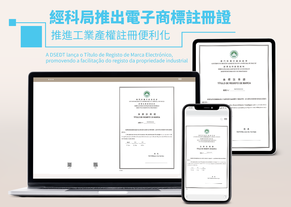 為持續推進和優化電子政務,落實商標註冊便利化進程,自2022年9月26日起,經濟及科技發展局透過“澳門公共服務一戶通”(以下簡稱為“一戶通”),推出電子商標註冊證。