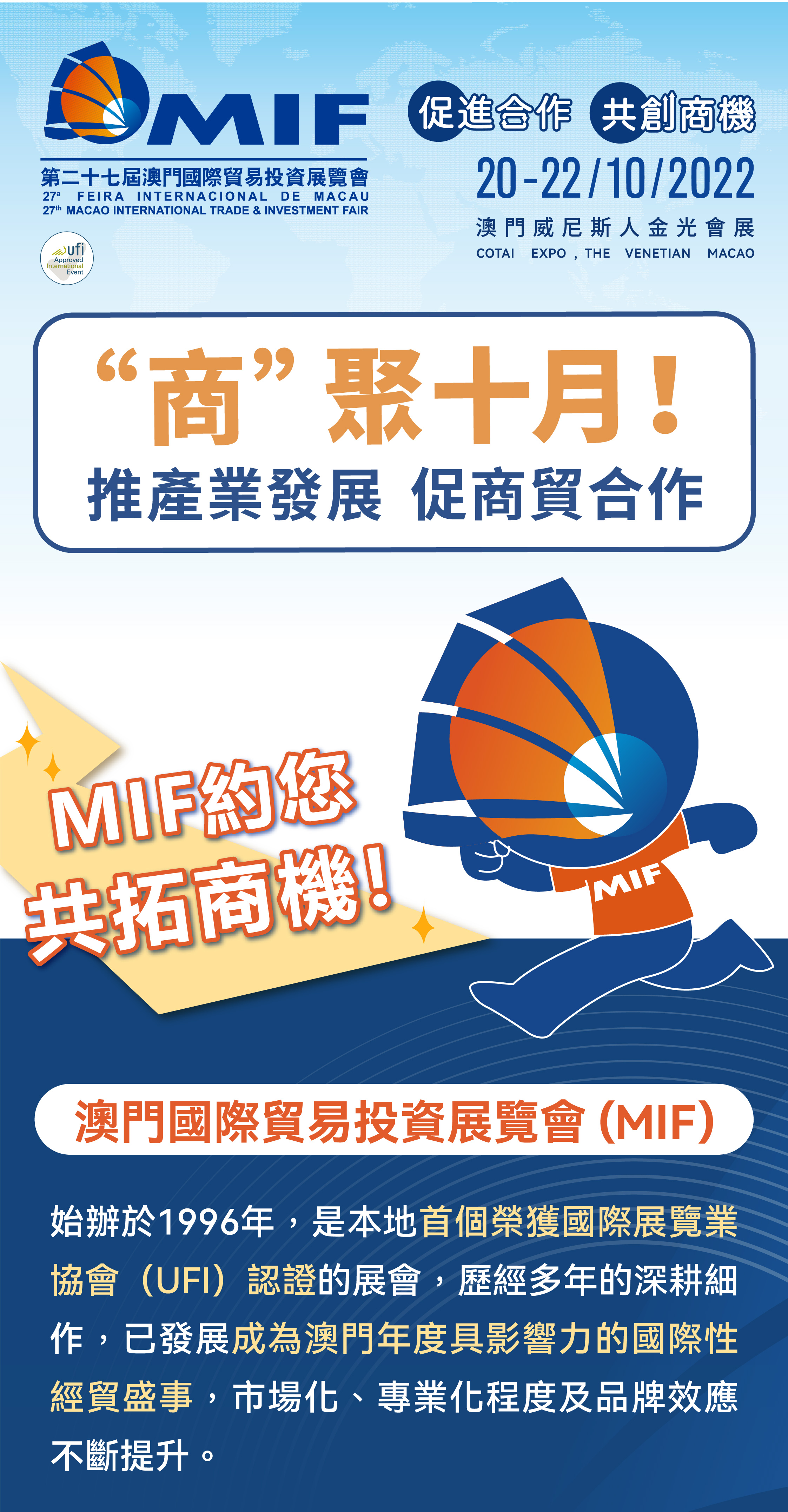 第27屆MIF將聯同“澳門國際品牌連鎖加盟展2022”(2022MFE)及“2022年葡語國家產品及服務展(澳門)”(2022PLPEX),於2022年10月20至22日假澳門威尼斯人金光會展同期同場舉行。如欲瞭解最新資訊請關注微信號:MICE_IPIM或瀏覽大會網站: www.mif.com.mo/。