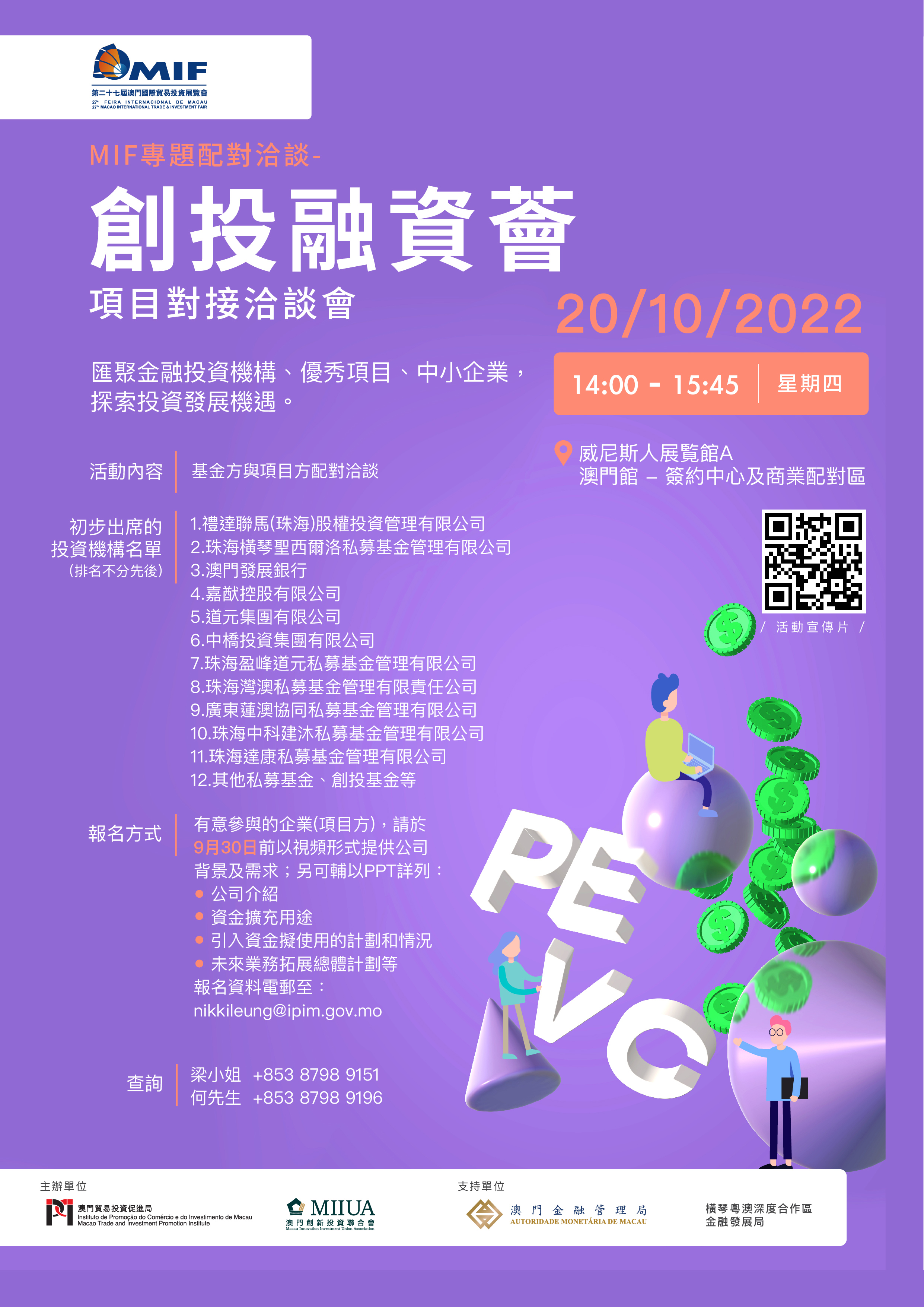 “創投融資薈”由澳門貿易投資促進局及澳門創新投資聯合會主辦,並獲澳門金融管理局及橫琴粵澳深度合區金融發展局作支持單位。