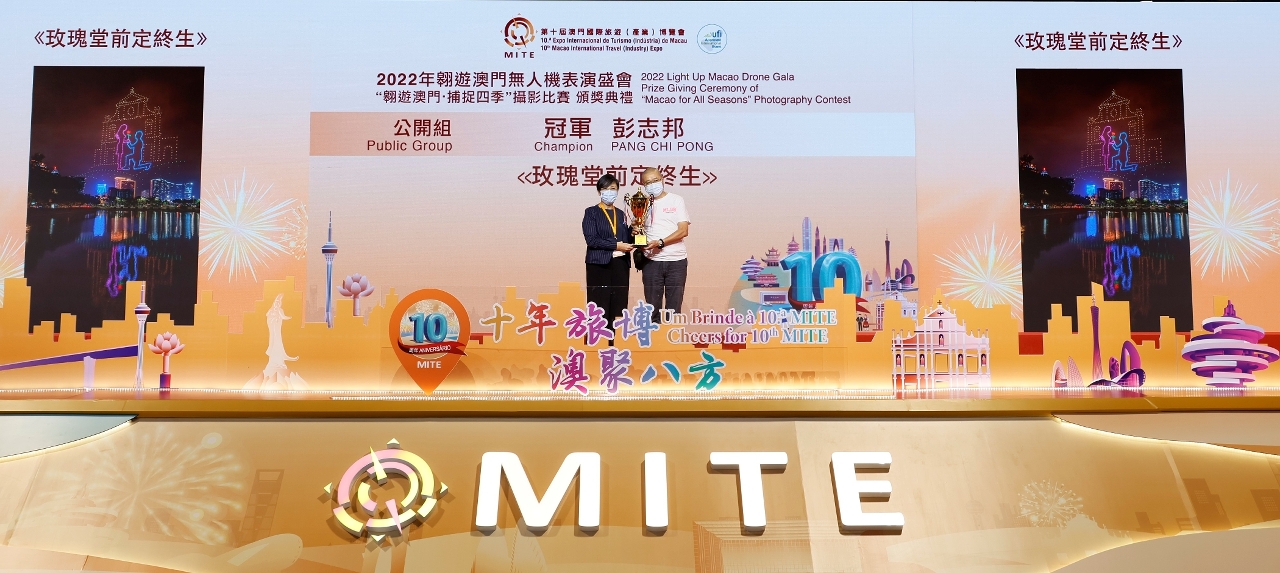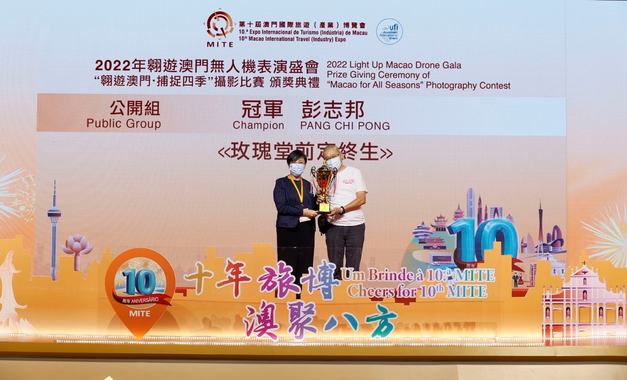 旅遊局於本年5月舉辦“2022翱遊澳門無人機表演盛會”,呈獻精彩無人機表演之餘,更增設多項延伸活動,增加居民和旅客對無人機盛事的參與和投入。當中延伸活動 “翱遊澳門‧捕捉四季”攝影比賽及“翱遊澳門‧飛出框框”構圖設計比賽頒奬禮今(25日)在第十屆澳門國際旅遊(產業)博覽會上舉行。
