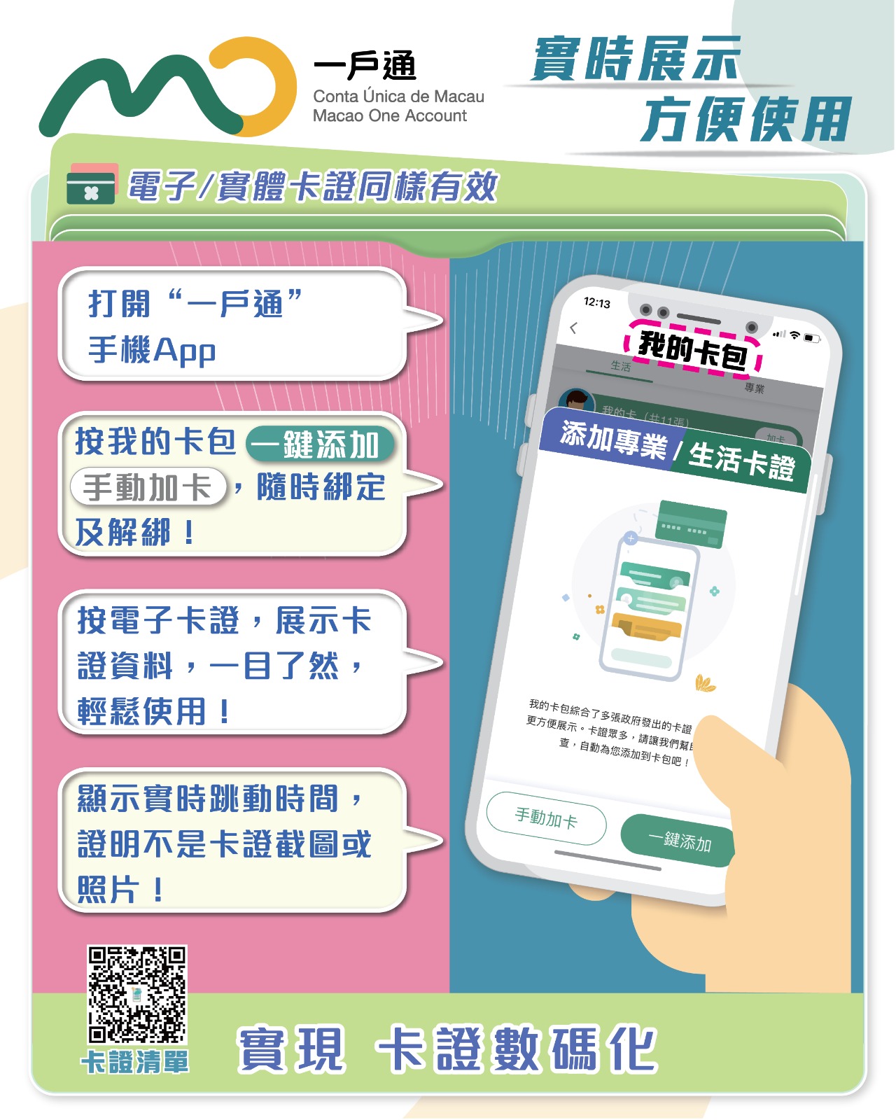 詳細卡證清單請瀏覽“一戶通”專題網站(https://www.gov.mo/zh-hant/app/),或掃描圖文包二維碼獲取資訊。