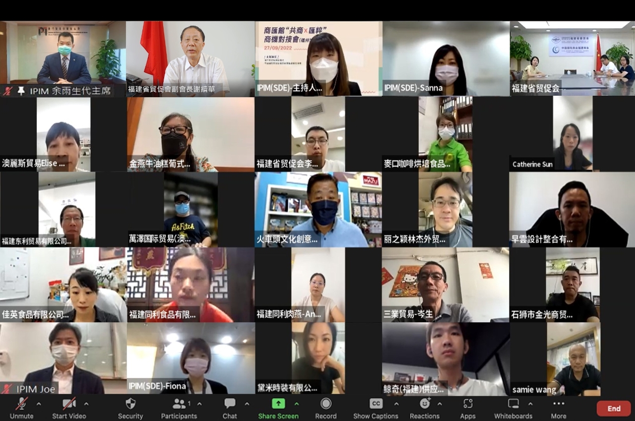繼廣州、瀋陽站後,澳門貿易投資促進局與中國國際貿易促進委員會福建省委員會今(27)日聯合主辦商匯館“共商x匯粹”商機對接會 ─ 福州站,組織34家澳門及福建企業,線上進行逾40場商務洽談,範疇涵蓋貿易、食品加工、零售批發、文創設計等。