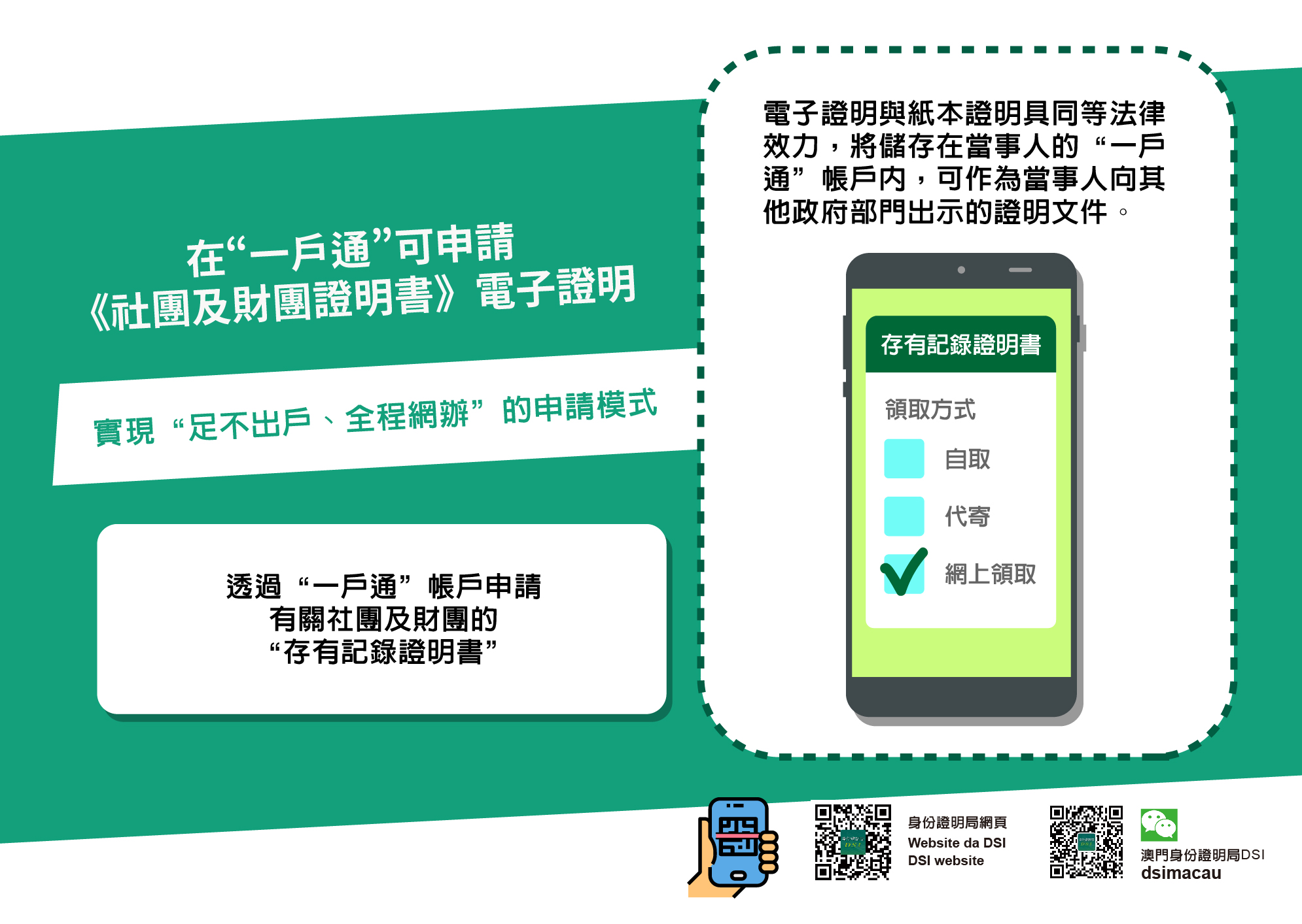 合資格申請人只需使用其“一戶通”帳戶登入“一戶通”手機應用程式或身份證明局網頁(www.dsi.gov.mo)辦理有關社團及財團的“存有紀錄證明書”,申請時便可選擇以紙本證明或電子證明的方式接收相關證明書。根據法律規定,該電子證明與紙本證明具同等法律效力,將儲存在當事人的“一戶通”帳戶內,可作為當事人向其他政府部門出示的證明文件。