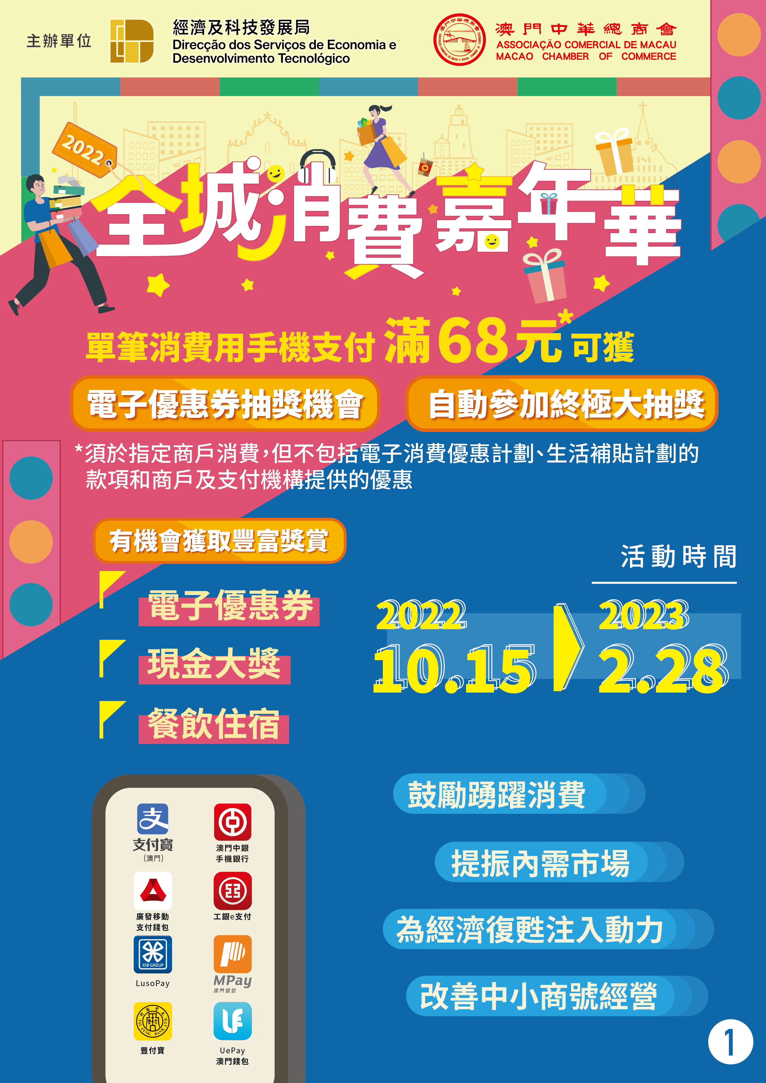 “2022年全城消費嘉年華"將於10月15日正式推出,直至明(2023)年2月28日,活動為期長達20週。活動獎金獎品總值近1億澳門元,活動期間,通過實名認證的電子錢包用戶於全澳線下大部分實體店舖消費時,透過移動支付單筆實付滿68元(澳門元,下同),即可獲得抽獎機會獲取電子優惠券,更可於活動結束後參加終極大抽獎。終極大抽獎獎品豐富,包括總值高達100萬元現金、餐飲住宿等。