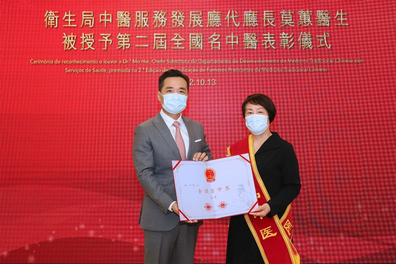由國家人力資源社會保障部、國家衛生健康委員會和國家中醫藥管理局組織的第2屆全國名中醫評選工作,今年在全國範圍內共評選出101名全國名中醫,港澳地區是首次參與評選,衛生局中醫服務發展廳莫蕙代廳長成為澳門首位獲得此項殊榮的中醫生。莫蕙代廳長被授予第2屆全國名中醫表彰儀式於今(13)日舉行,中央人民政府駐澳門特別行政區聯絡辦公室宣傳文化部萬速成部長,澳門特別行政區政府衛生局羅奕龍局長、郭昌宇副局長、鄭成業副局長、陳永華副局長等出席了表彰儀式。