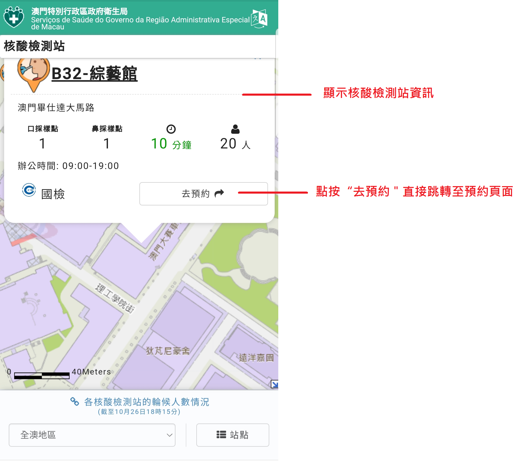 1. 使用者可點按新冠病毒核酸檢測預約系統主頁上方連結或直接使用以下連結進入地圖:https://app.ssm.gov.mo/rnastation/map;(附圖一)