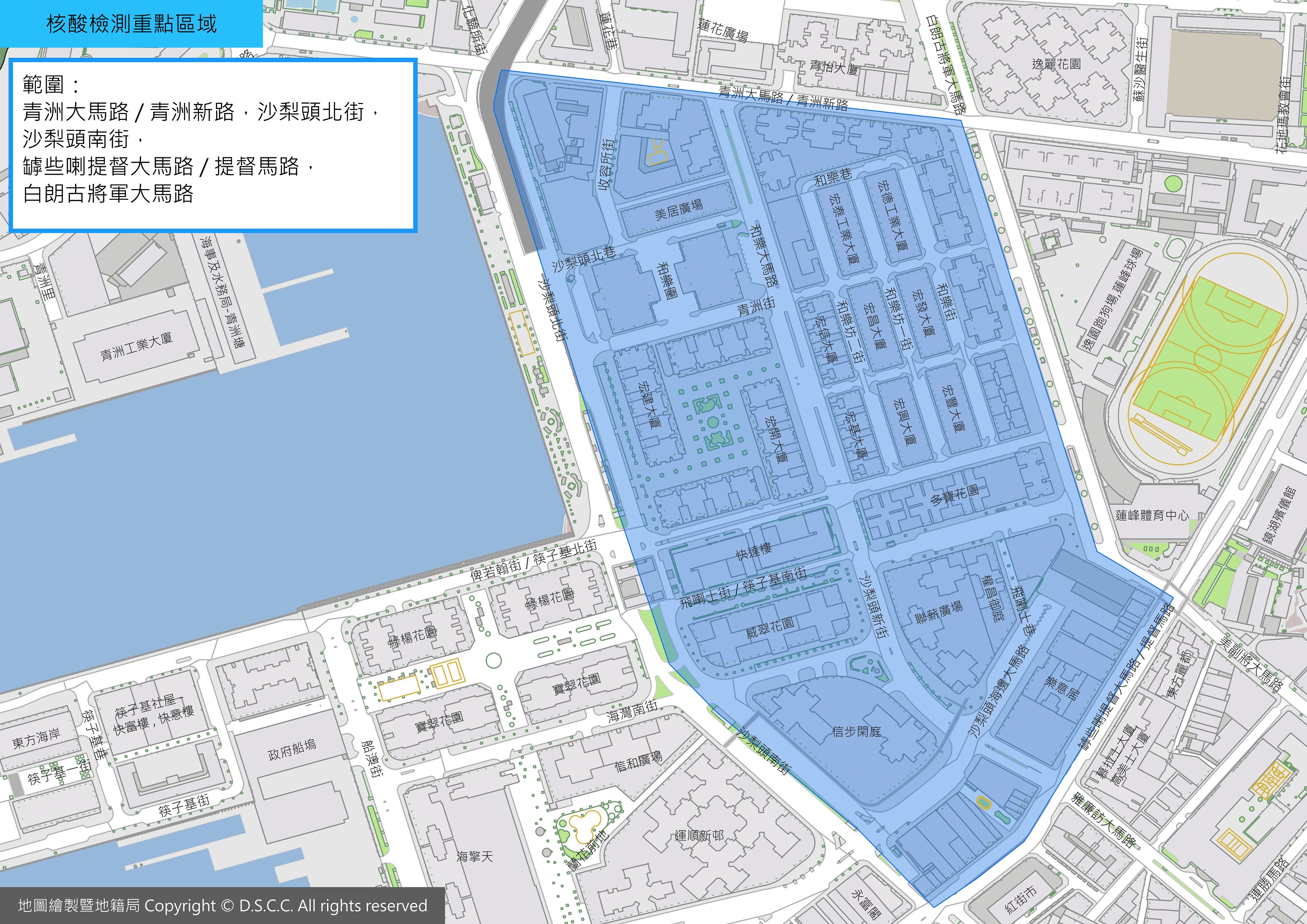 新型冠狀病毒感染應變協調中心(下稱應變協調中心)公佈,今(26)日上午,收到珠海市衛生部門通知,1管10混1核酸檢測樣本呈陽性,而涉及的8人在澳門,應變協調中心立即啟動應變機制,安排該8名人士接受檢測。當中1名66歲女性澳門居民檢測到新型冠狀病毒核酸陽性,其居住的和樂坊第一街7號及8號宏興大廈列為紅碼區。為此,針對其經常出入的區域,於10月26日下午4時開展重點區域核酸檢測,以排除可能潛伏於本澳社區的新冠肺炎感染者。以下重點區域人士須於10月26日、27日及28日每天進行一次核酸檢測。