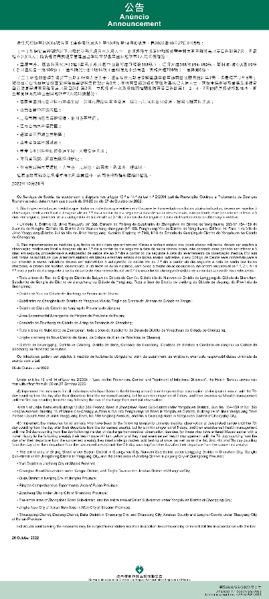 新型冠狀病毒感染應變協調中心(下稱應變協調中心)宣佈,因應內地的疫情變化,衛生局根據第2/2004號法律《傳染病防治法》第10條和第14條的規定,自2022年10月27日凌晨1時起,新增或取消對曾到內地相關區域人士的防疫措施: