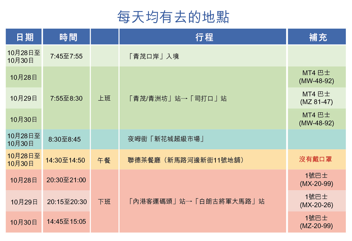 她並公布 58歲在魚欄工作的送貨員詳細行程 (見附圖1- 4),當局呼籲若市民同一時間曾去過聯德茶餐廳(新馬路河邊新街11號地舖),目前尚未接獲衛生局聯絡,應主動聯絡應變協調中心,以便評估風險和安排相應的管控措施,如曾去過行程內的其他地方,亦應主動 3天 2核檢。
