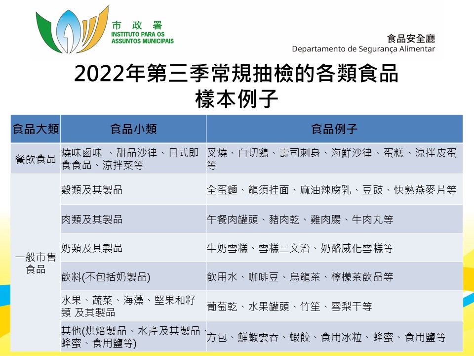 第三季抽檢的八百九十七個食品樣本中,包括四百三十六個一般市售食品樣本和四百六十一個餐飲食品樣本,抽檢點涵蓋本澳各區食肆、外賣店、超級市場、雜貨店及百貨公司等。市政署對相關食品樣本進行了檢測,當中微生物檢測項目包括沙門氏菌屬、單核細胞增生李斯特氏菌、蠟樣芽孢桿菌等常見致病菌;化學檢測項目包括重金屬、食品添加劑及禁用物質等;而輻射檢測項目則包括銫同位素和碘同位素等放射性物質。