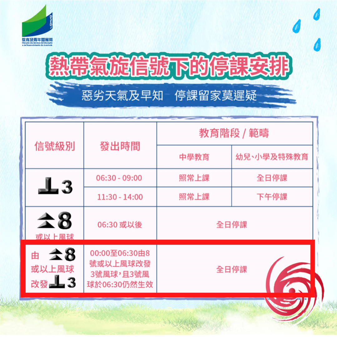 因應氣象部門於今日上午7:00改發3號風球,按照非高等教育學校在熱帶氣旋、暴雨及特殊天氣情況下的停課安排,當凌晨00:00至上午6:30由8號或以上風球改發3號風球,且3號風球於上午6:30仍然生效,中、小、幼及特殊教育全日停課,校方應確保校舍開放及安排人員照顧已返抵學校的學生,直至情況適宜學生安全回家為止。