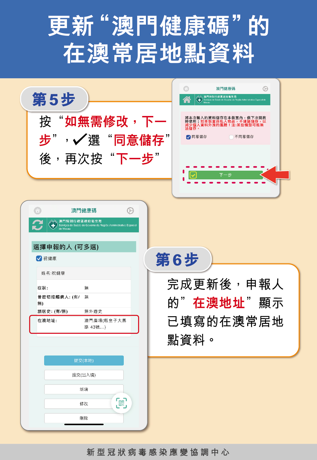 應變協調中心再次呼籲,為免因須重新填寫在澳常居地點資料,導致未能即時生成健康碼而引起不便,居民應預早檢視目前在澳常居地點資料,並可參閱以下圖文包完成地址更新;此外,社會工作局亦已於11月3日起在其轄下各社會工作中心為有需要人士提供更新及輸入在澳常居地點資料的協助。