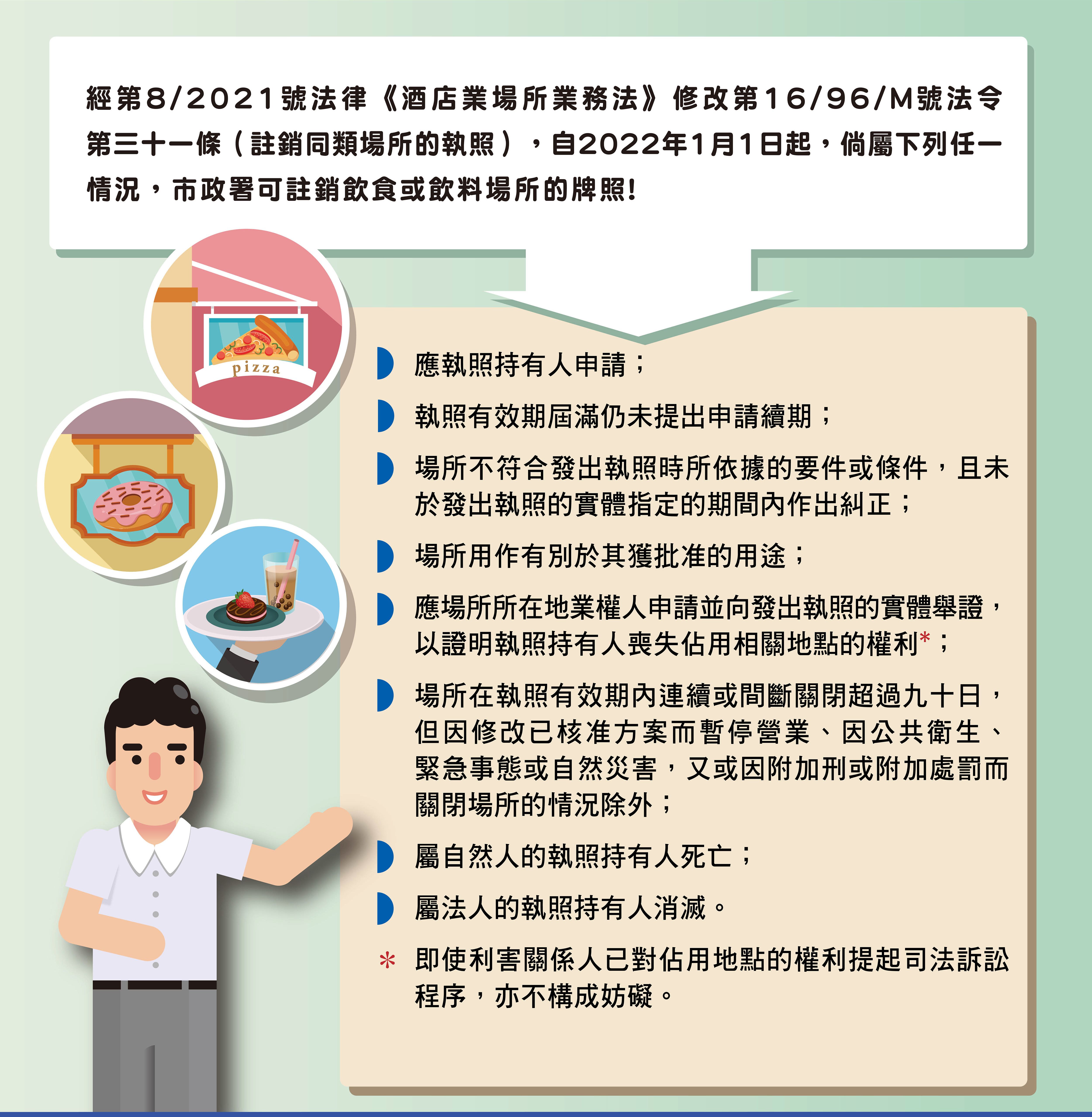 根據第8/2021號法律《酒店業場所業務法》,對註銷同類場所牌照的相關規定作出修改,訂明在“執照有效期屆滿仍未提出申請續期”等情況下,可被註銷牌照。市政署提醒持牌人留意新法相關規定,依時遞交續期牌照的申請。