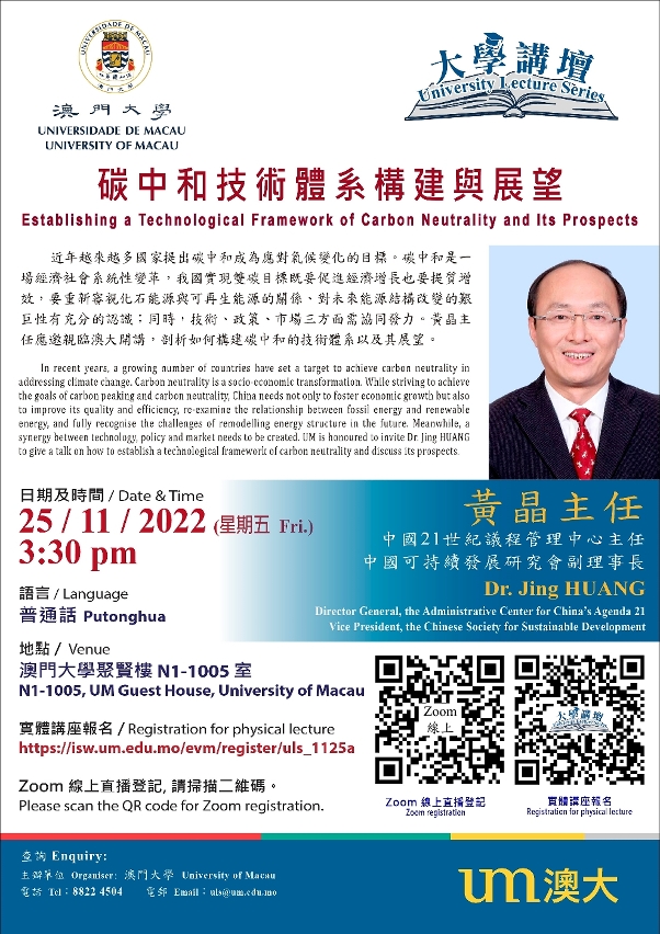 澳門大學將於11月25日(星期五)舉辦“大學講壇”講座,由中國21世紀議程管理中心主任、中國可持續發展研究會副理事長黃晶擔任講者,就“碳中和技術體系構建與展望”為題發表演說,探討國家為達至碳中和所作的努力,以及如何構建相關的技術體系。講座以線上及線下形式舉行,歡迎有興趣人士參加。