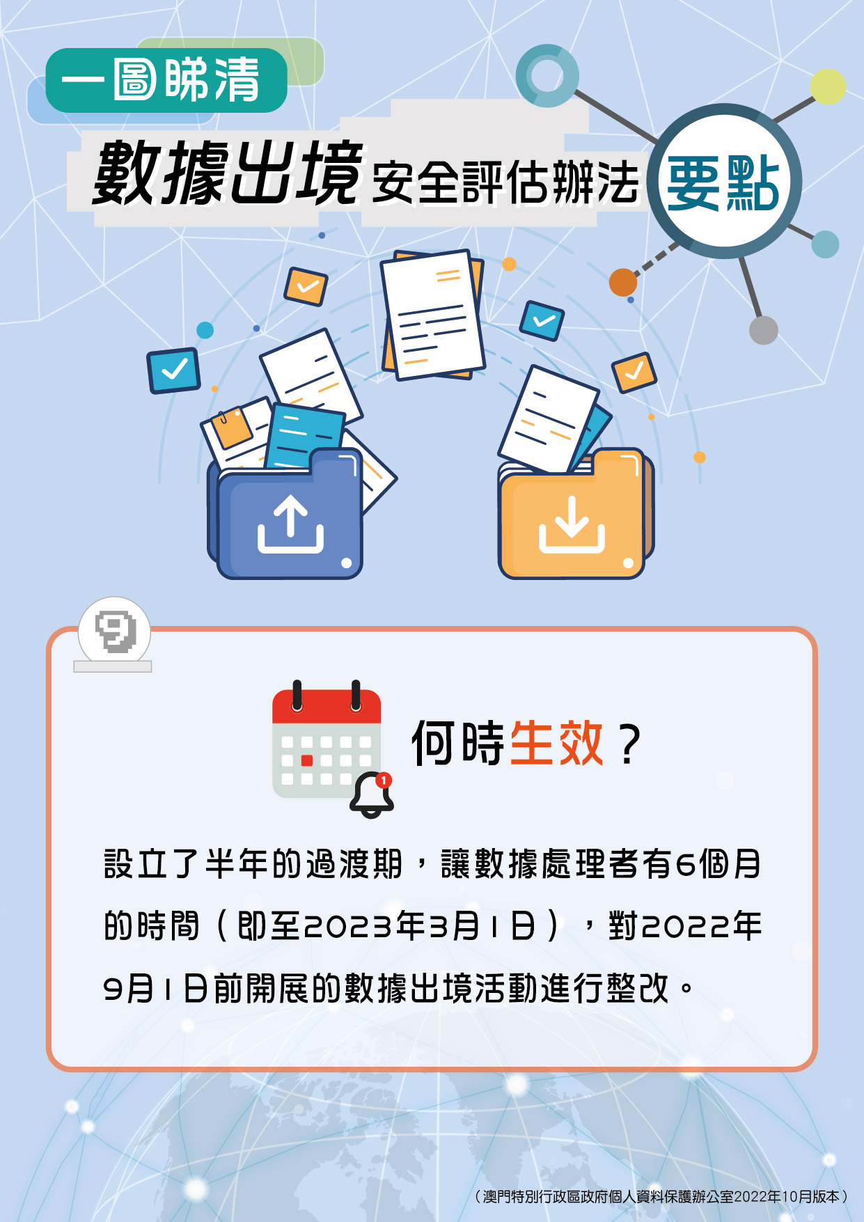《評估辦法》設立了半年的過渡期(至2023年3月1日),讓數據處理者對2022年9月1日前開展的數據出境活動進行整改,以便相關的處理符合《評估辦法》的相關規定。如本澳的企業、機構訪問或調用設於內地的資訊設備系統的數據,且有關數據處理適用《評估辦法》所訂明的情況,應盡快檢視相關規定對其數據出境活動的影響,做好合規審查以符合相關的監管要求和法定義務,避免數據不法出境。有關《評估辦法》的詳細內容,歡迎瀏覽個資辦網頁中的“協助中小企等機構做好《中華人民共和國個人信息保護法》合規工作專頁”(https://www.gpdp.gov.mo/featuredsites/notification/main.html)。