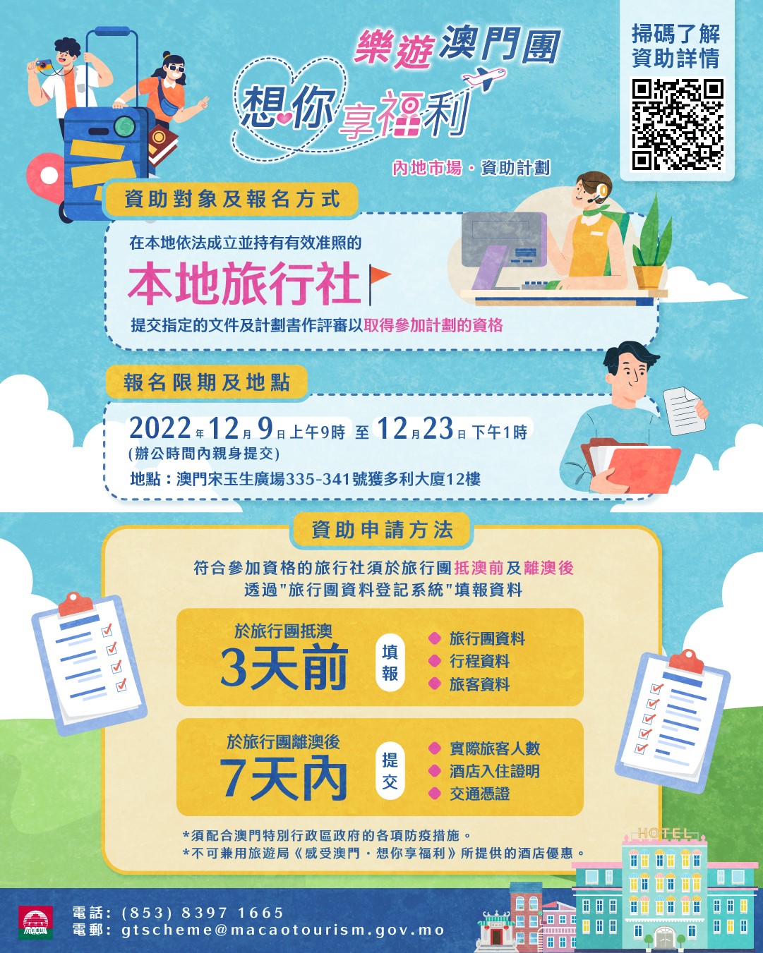 旅遊局推出《想你享福利.樂遊澳門團》資助計劃,鼓勵本地旅行社於2023年加強內地市場推廣宣傳澳門多元旅遊路線,吸引更多內地旅客以旅行團方式訪澳,達至擴展客源提振經濟復甦,並持續推動優質旅遊發展。計劃即日起接受本地旅行社報名。