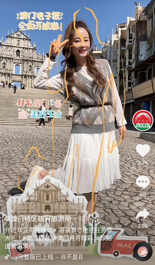 此外,旅遊局抖音官方賬號持續發佈短視頻和宣傳片,並通過抖音“全民任務”,推出“一鍵遊澳門”貼紙模版拍攝,方便創作者豐富澳門旅遊相關內容,製作及播送大量貼紙短片,積極宣傳澳門電子簽注全面開放及免核檢通關等重要訊息,提升社交媒體中的話題熱度。