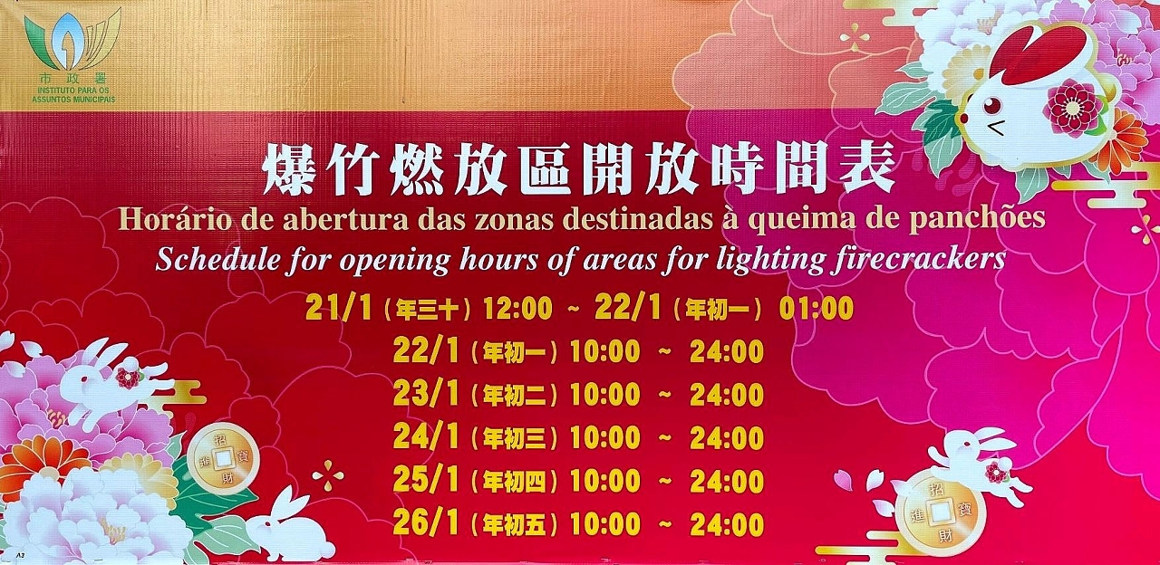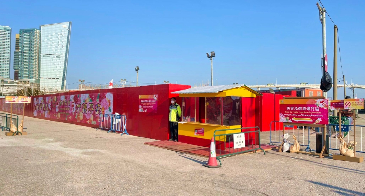 澳門半島的爆竹燃放區位於澳門孫逸仙大馬路(近旅遊塔新城填海地),而氹仔的爆竹燃放區則位於史伯泰海軍將軍馬路近海傍一帶。兩個燃放區內設有急救站以及急救人員,以備有需要時為市民提供協助,並各設有四個售賣爆竹、煙花、火箭的攤檔,開放時間為一月二十一日(年三十)中午十二時至翌日凌晨一時、一月二十二日(年初一)至二十六日(年初五)上午十時至晚上十二時。