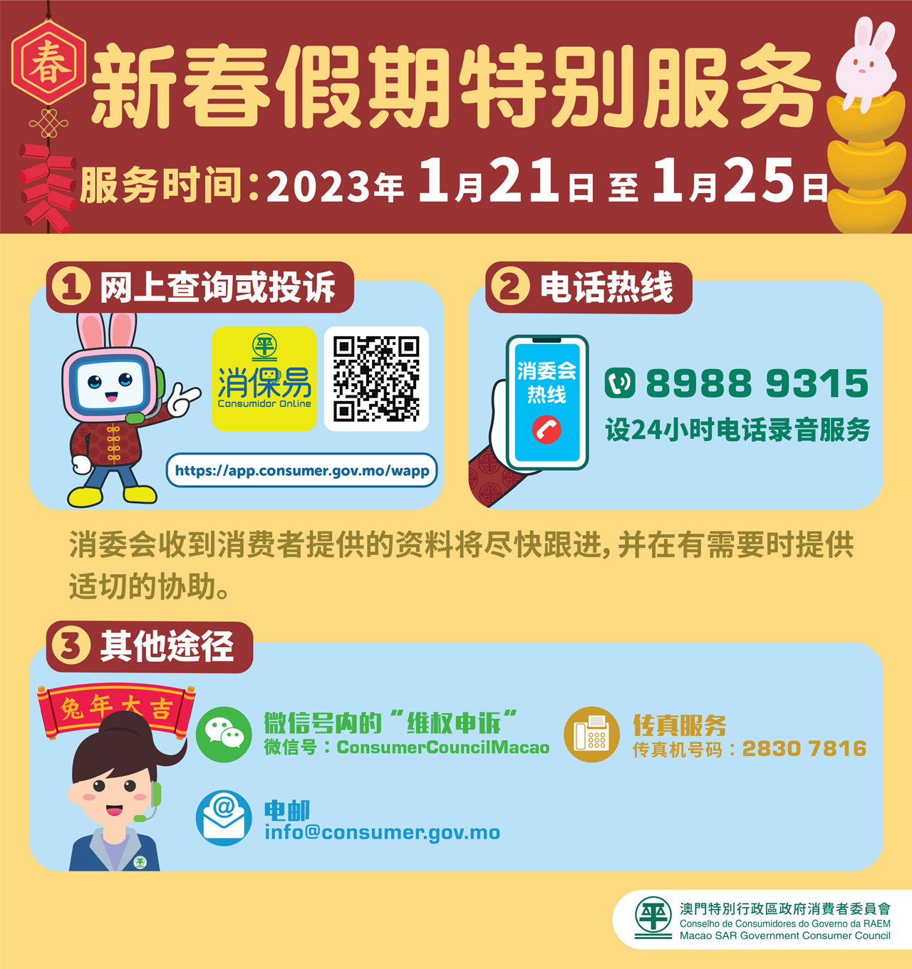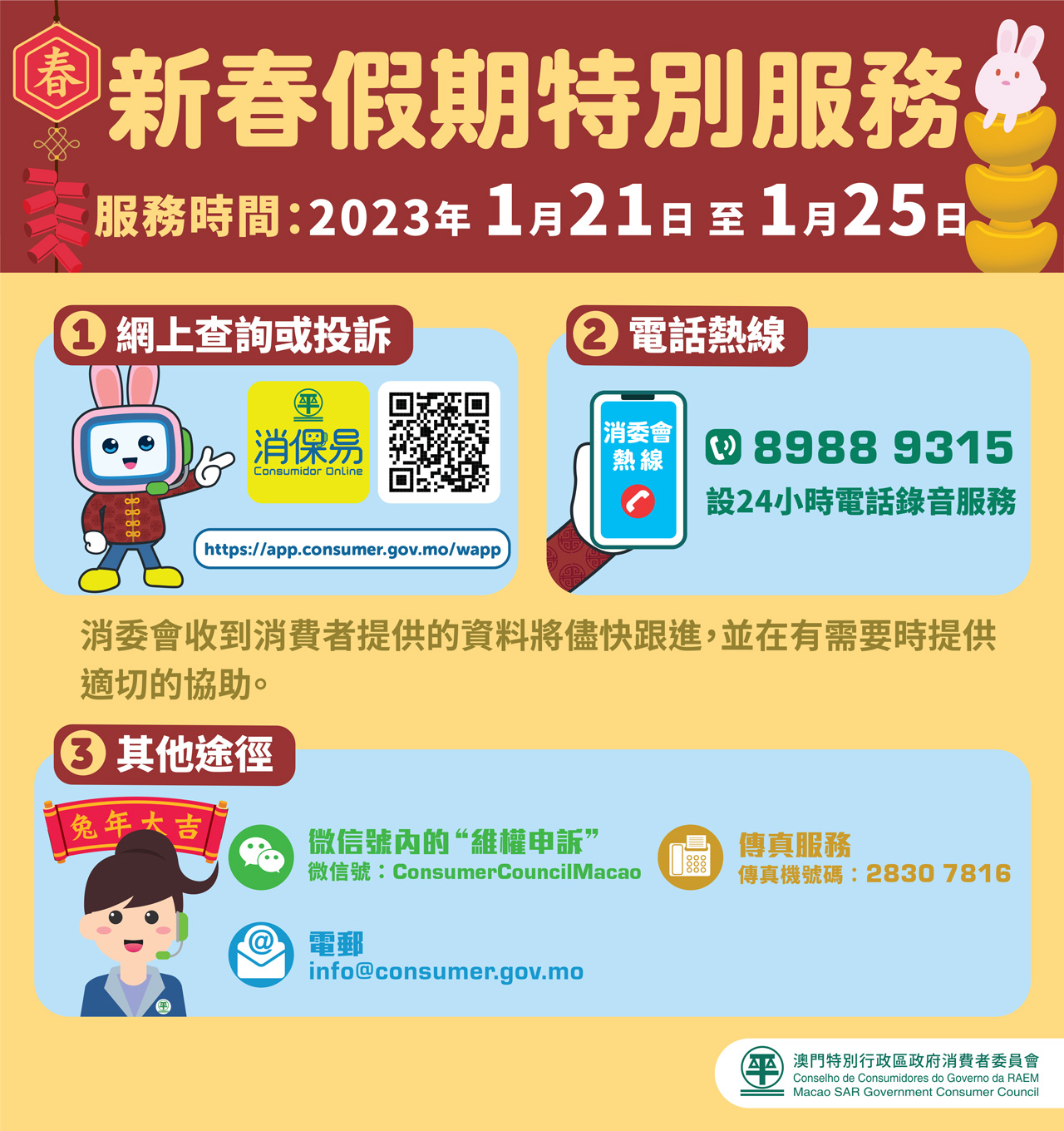 消費者在上述期間,如有查詢或投訴可透過以下途徑聯絡消委會: