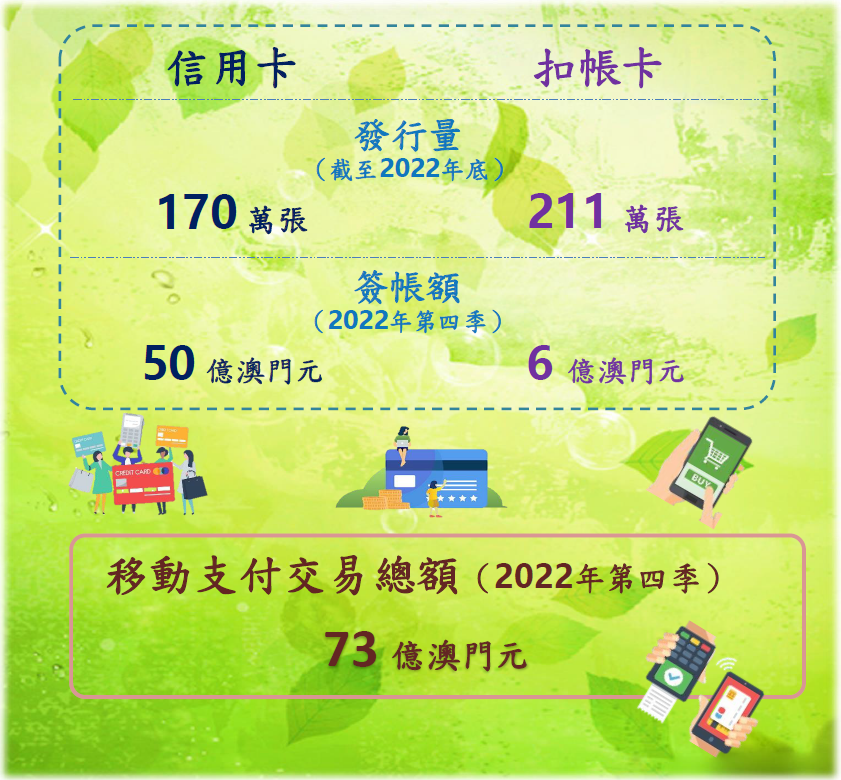 由澳門銀行核發的個人信用卡總數於2022年底為1,702,444張,與9月底比較上升2.0%。澳門銀行核發的扣帳卡總數達2,109,930張,按季增加0.7%。