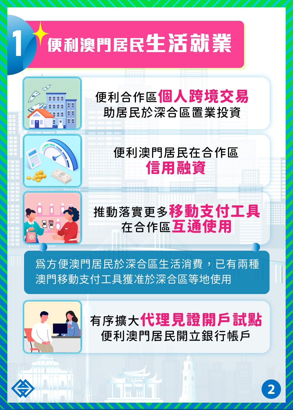 為方便澳門居民於深合區生活消費,已有兩種澳門移動支付工具獲准在深合區等地使用,以及三家澳門銀行可代理見證開立內地銀行賬戶。隨着《意見》的出台,金管局將與內地金管當局推動落實移動支付工具互通使用,有序增加代理見證開戶的試點銀行,推動澳琴業界提供更便利的民生金融服務。