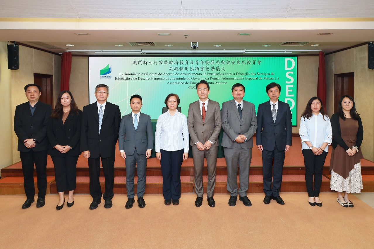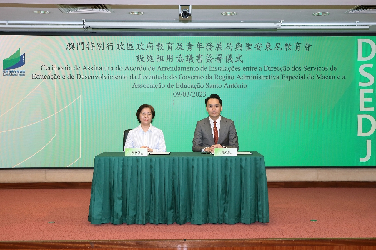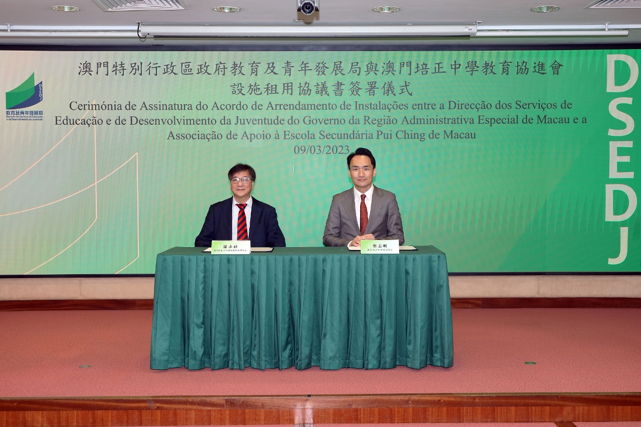 根據第 7/2023 號及第 8/2023 號社會文化司司長批示授予之權力,2023年3月9日,教育及青年發展局局長龔志明代表特區政府分別與澳門培正中學教育協進會代表羅永祥理事長、及聖安東尼教育會代表黃潔英理事長簽署設施租用協議書。