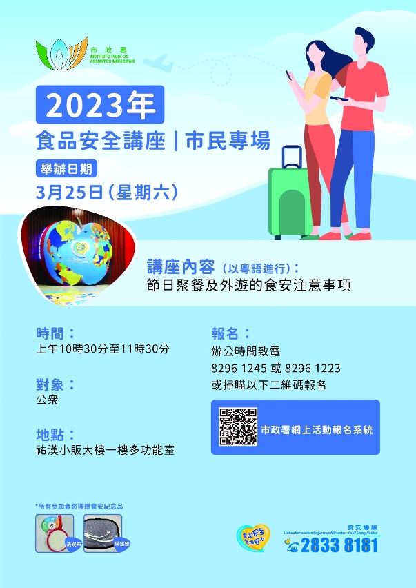市政署每季定期舉辦巿民專場的食品安全講座,今季定於三月二十五日上午十時三十分至十一時三十分,於祐漢小販大樓一樓食品業界專區多功能室舉行。講座以粵語進行,費用全免。有興趣的市民可由即日起至三月二十一日,透過市政署網上活動報名系統 https://app.iam.gov.mo/ActivityWeb,或於辦公時間內致電8296 1245、8296 1223報名。