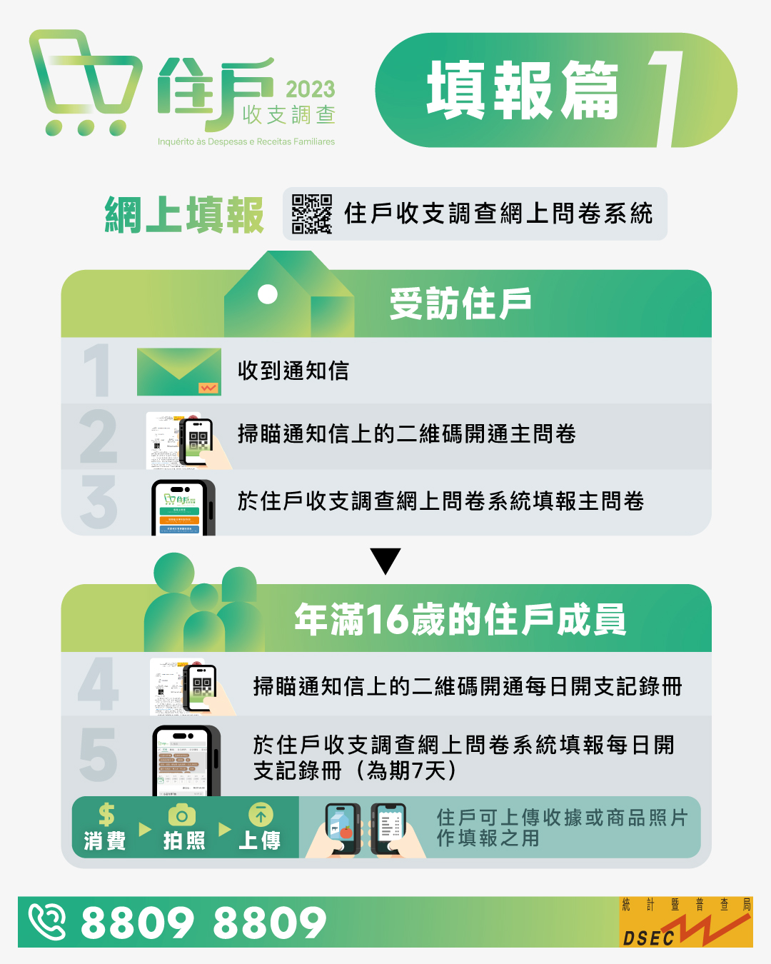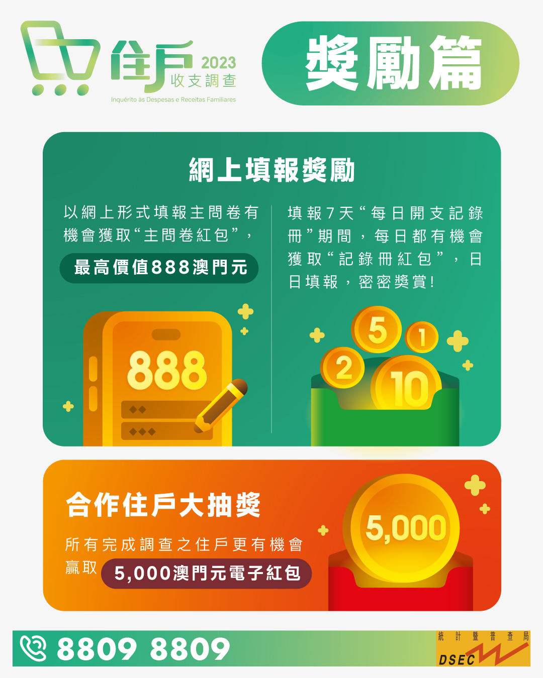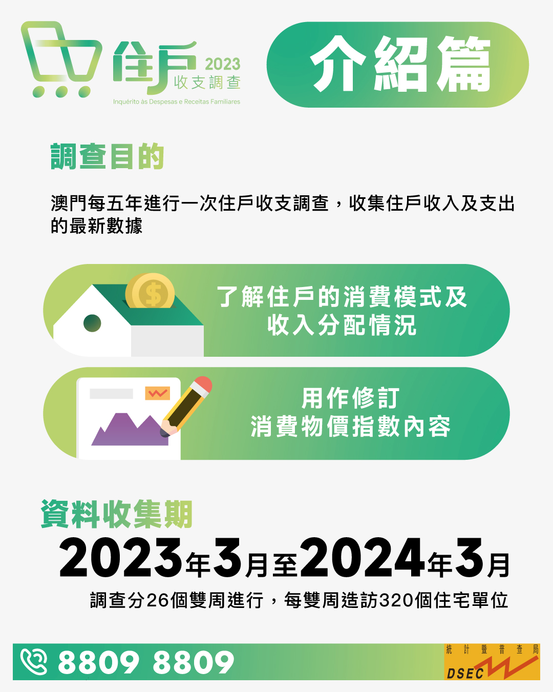有關2023住戶收支調查的詳情,請瀏覽2023住戶收支調查專頁(https://www.dsec.gov.mo/IDRF2023),或致電熱線8809 8809查詢。
